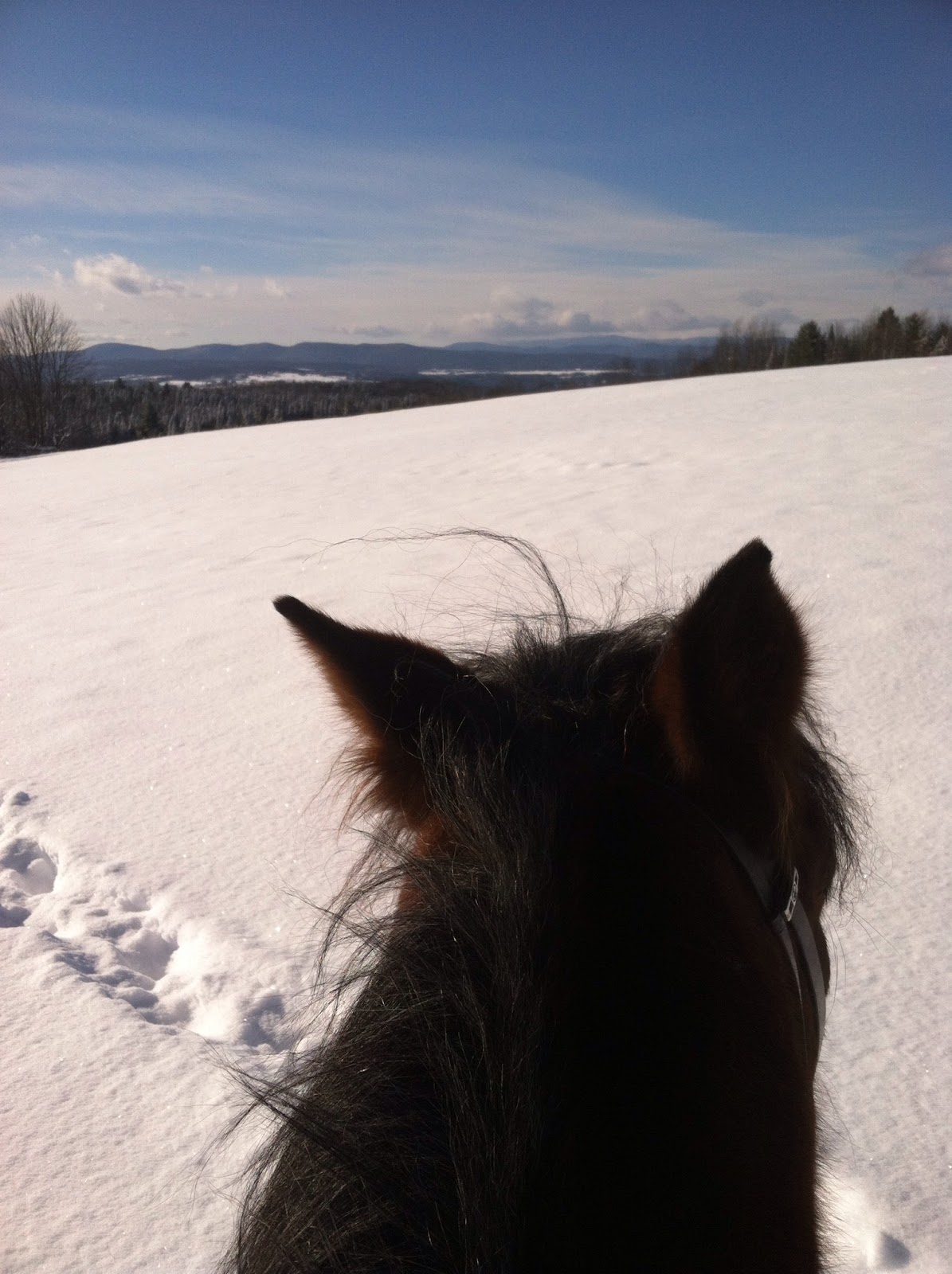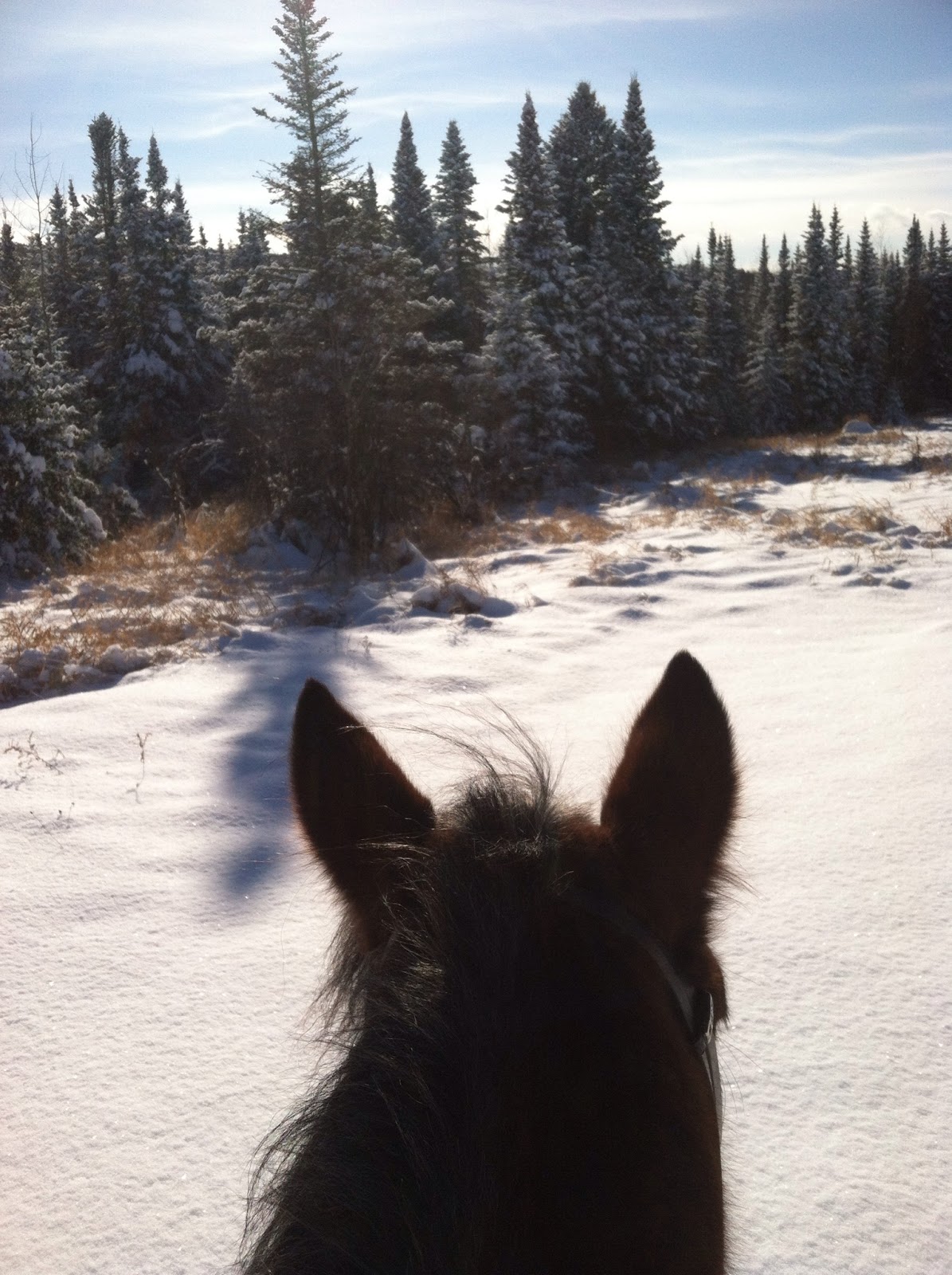 I did get my hack in, though, down and around all the summer paddocks, and it was a beautiful crisp day. The snow was still so new it was clinging to the trees, and the air was clear and thin all the way to the mountains. We forged through fresh drifts and Tristan was happy and cheerful, though not thrilled to be working so hard on a restful walk.