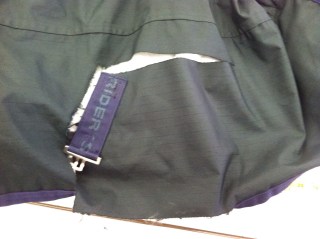 Then I headed to the barn and found that my idiot pony had shredded his midweight sheet. He only wears it when it’s below zero, which unfortunately means he’s been wearing it a lot lately. Best theory is that he laid down in the night and upon getting up again tangled a hind leg in the surcingle, and ripped the buckle clean away from the sheet, along with a nice rip along the seam. It was torn in such a way that it couldn’t be stitched up easily and quickly by a conventional sewing machine.