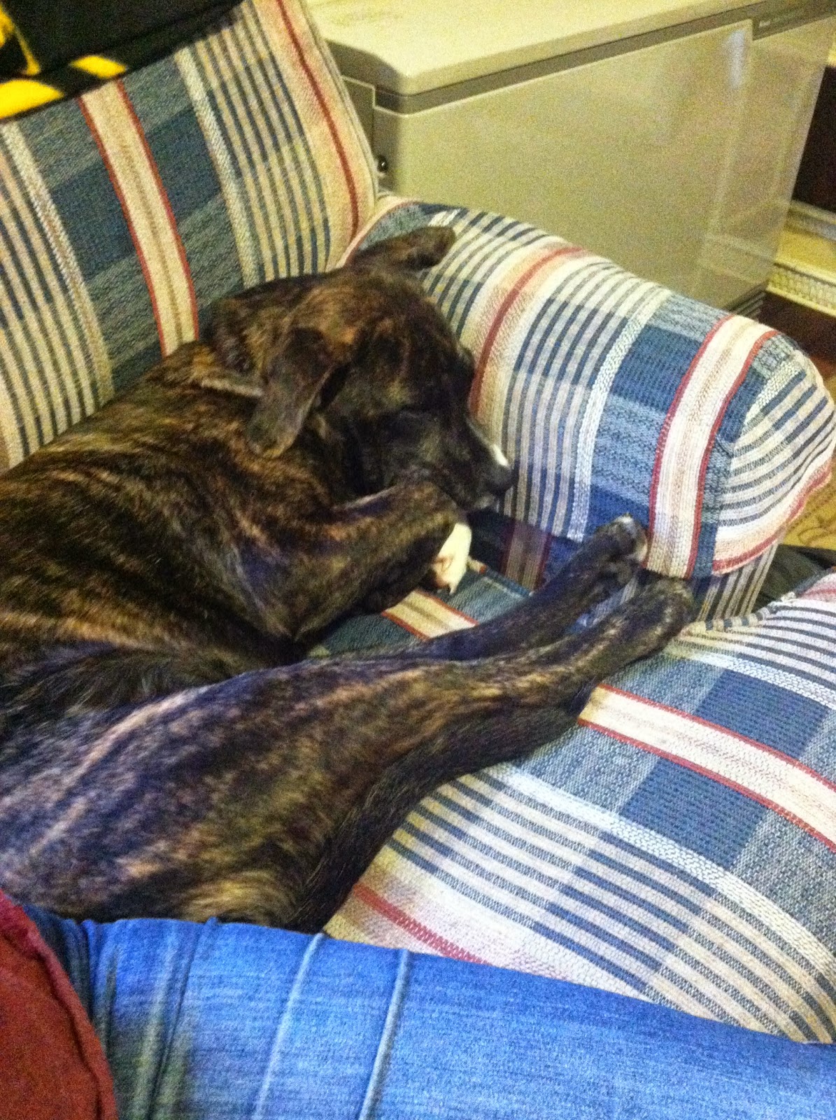 Cute!! My dog sleeps with her hind feet up by her nose, too. I think it's hilarious!
