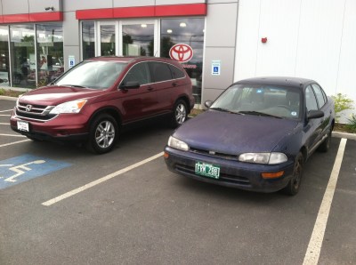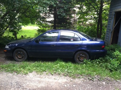 Then at the end of the day, I sat in a 1997 Geo Prizm (in 2005). It had 70k miles on it already and on paper would not have been the right car. I saw it across the lot, thought “hmmmm,” and went and sat in the driver’s seat. I knew instantly that this was my car. Formalities were observed: we took it on a test drive down to the local library and looked up the Consumer Reports, negotiated with the dealership, but it was all a foregone conclusion.