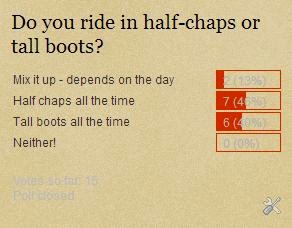 Last week, I posted that I was starting to ride in half chaps more and more often, and asked you all what you chose to ride in. The poll closed yesterday, and the results?