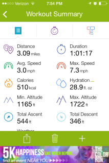 Our walk back was good, and I took a bit of a hold of the reins and asked for a little coming through the bit, which he obliged. We got back to flat ground and his hind end went all wobbly! So we walked on the flat road for another half mile to help him work out of it, which he did nicely. So this ride definitely accomplished what I wanted it to – hard hill work – and it’s good that he has tonight scheduled off.