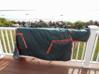 My good friend J. dropped off a few turnout blankets for Tristan last week. They are in need of some minor repairs, and re-waterproofing. I dropped one of the blankets off for repair (I don’t have a sewing machine that will punch through the strapping), and yesterday tackled the first of the re-waterproofing.