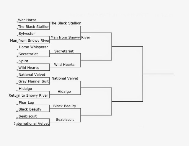 The Black Stallion handily beat out War Horse in round 1. The Man from Snowy River had a slightly tougher battle against Sylvester, but still never gave up its early lead.