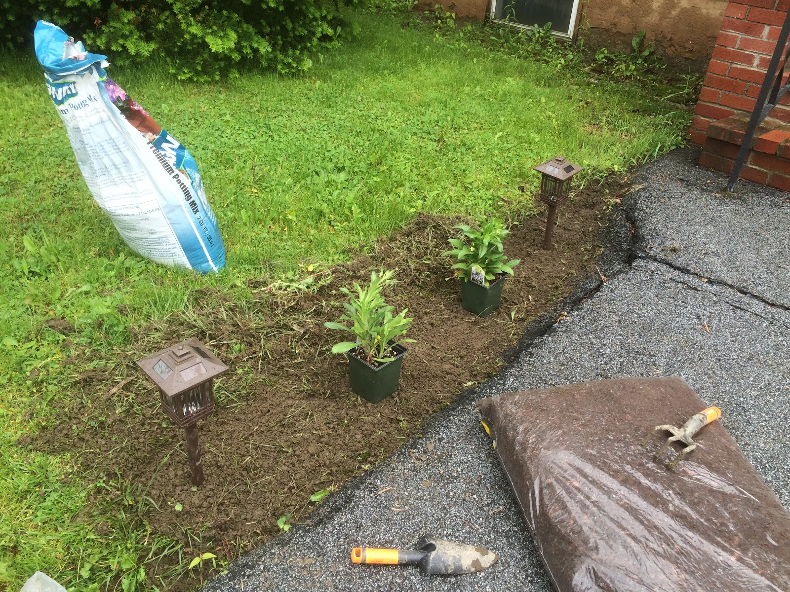 Step 2: Plant the daisies and set the lanterns. I may have half-assed the sod removal on the right-hand side a little bit. #sorrynotsorry.