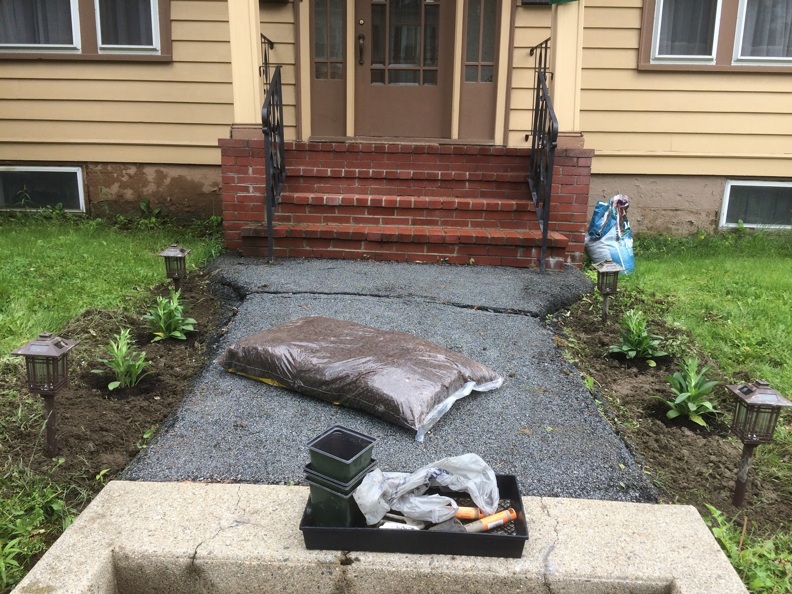 I had an idea for the front walkway start to bounce around a few weeks ago, and in the last week it coalesced. It started with some solar LED lanterns I found at Walmart, which matched both the style and the coloring of the house, and then took off from there.