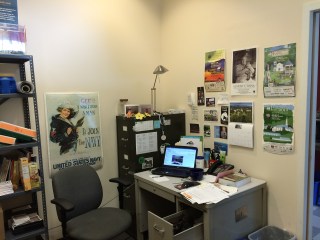 It’s kind of a mess, but yeah. Map of Vermont, that I refer to quite a lot actually since we’re always trying to plan trips or events so they make sense as we move around the state. Dinosaur of a printer that just will not die. (You know you work in nonprofits when…) If you turned left again you’d see the white board that I use to keep track of longer-range projects, as well as a complete run of our museum’s scholarly journal back into the 19th century. Partially there’s nowhere else to keep them and partially they’re a good reference. When I have an intern (maybe about 1/3 of the time) he or she sits at that table, which makes us quite cozy.