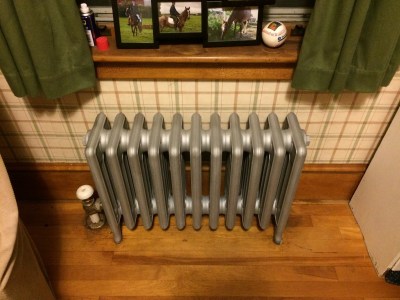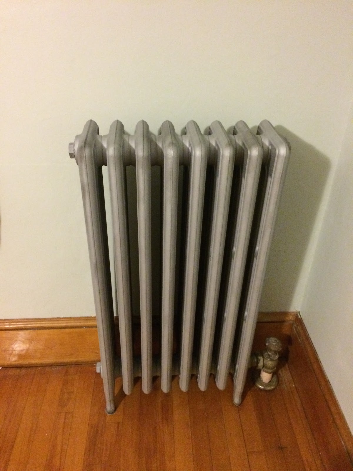 The paint in question: Rustoleum’s High Heat Enamel in Silver. It goes up to 2,000 degrees Fahrenheit, and is meant for grills and fireplaces. Hopefully the radiators will never get anywhere near that…