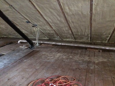 The idea was that this would be much more straightforward. The vent fan itself was already in the ceiling, put there by my father when we rewired the house. It just needed the venting itself. The theory was we would just pull up the floor and run the vent straight out underneath the attic floorboards.