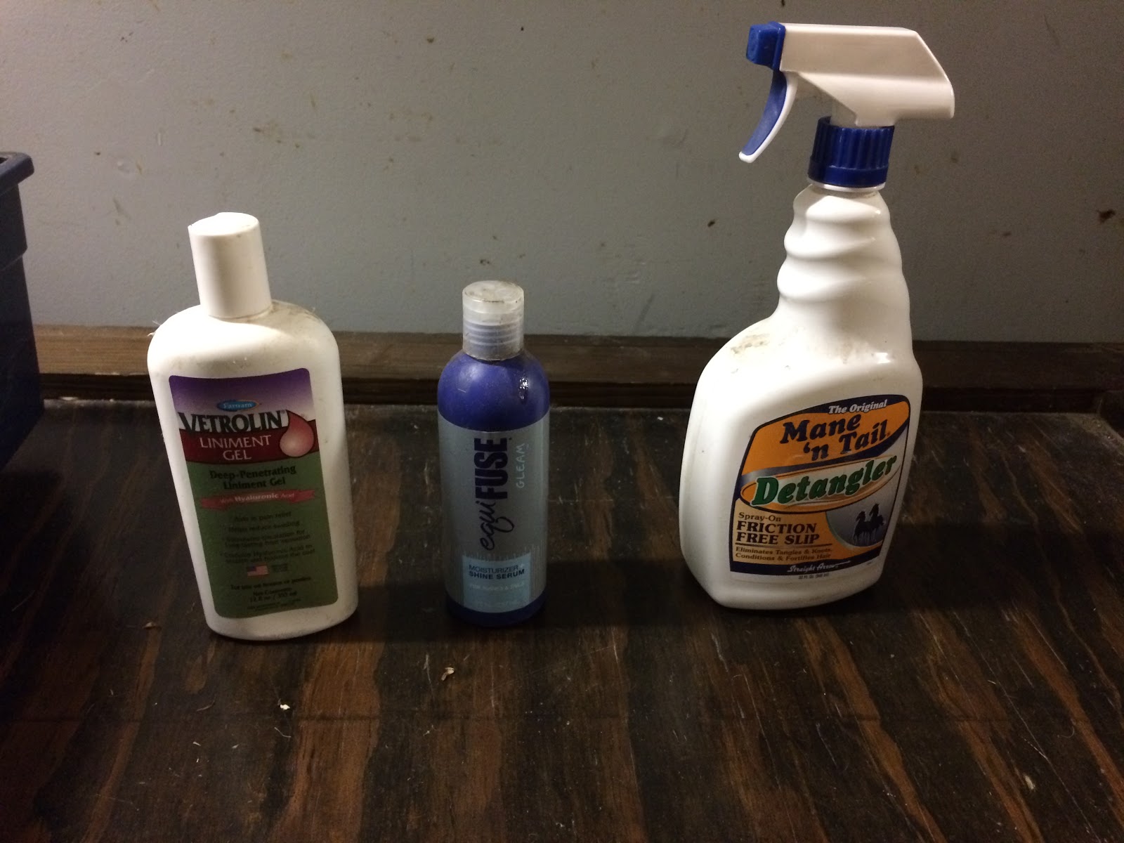 Sore No More for a while. I got the EquiFuse in my Blogger Gift Exchange package last year and when I remember to use it I love it. The detangler lives in the grooming box because I will frequently spray it on his tail even when I have no intention of combing it out; it helps keep things from getting too bad.