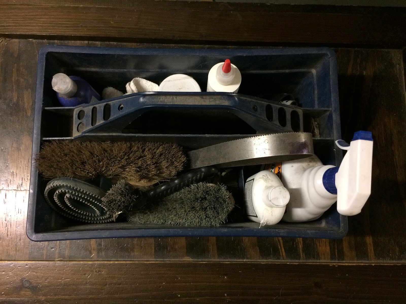 So my grooming kit was this small bucket that, if I tipped it sideways, would slide into the tack trunk. The problem with that was that you had to tip it just right, and even if you had the knack of it, half the time everything in it would fall out. I put up with it for years, because lo, I am lazy as shit.