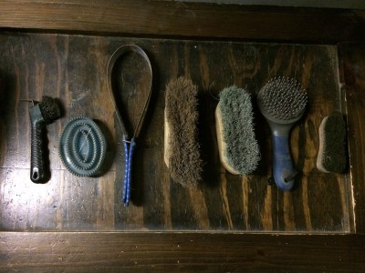 Left to right: hoof pick, curry comb (pro tip: buy a child’s size if you have tiny hands like me, it’s much easier to manage), shedding blade (this lives in year round; when he’s not shedding, he’s muddy, and fuck if I can remember to cycle it in and out), stiff brush, soft brush,