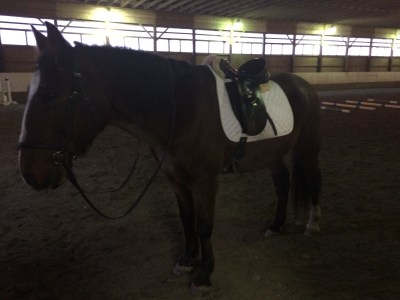 Last night, we had a terrific ride – a good, hard 50 minutes, with quality work interspersed with lots of walk breaks during which we practiced turning corners, serpentines, and lateral work. In the trot we worked on consistency in the bit over trot poles. In the canter we worked on going from straight long sides to circles on the bend, while keeping his head down and driving from the hind end. He was terrific. He was very, very tired.