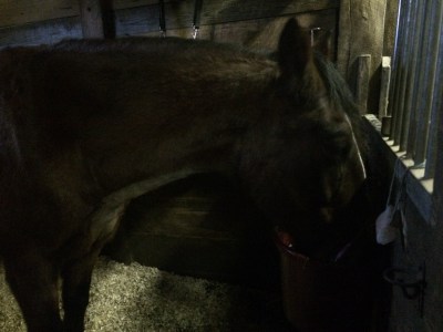 When I stepped into his stall, he looked at me, and shoved his head into the bucket. He slurped and slurped. He picked his head back up, looked at me, and shoved his head back into his bucket. This was not “oh I’m so tired and thirsty.” He’d been in the stall for several minutes with ample opportunity to take a drink, minutes he’d spent rooting around for hay scraps and licking his grain bucket.