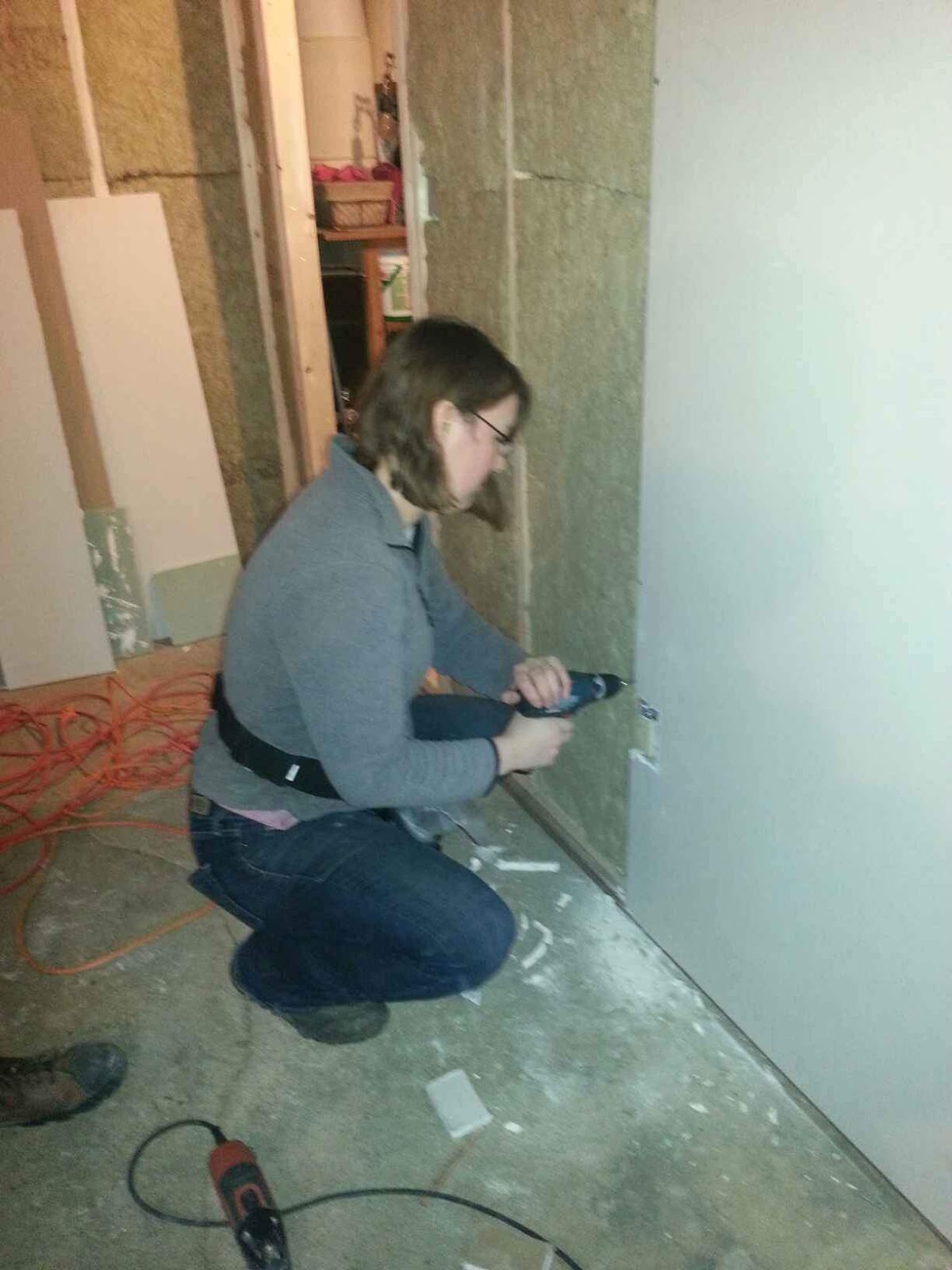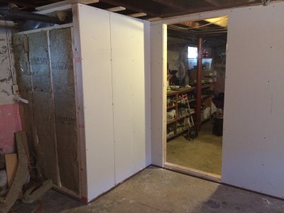 Then we sheetrocked almost all of the other side. Cue lots and lots of measuring, re-measuring, and swearing. My dad insists that a really good drywall guy could’ve done both sides of the wall in just a few hours, but whatever. It’s getting done, and the quote I got from the drywall guy was in the multiple thousands of dollars and way out of the budget.