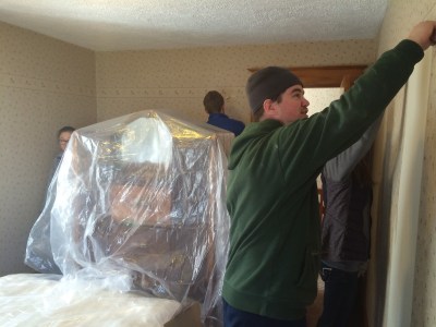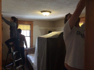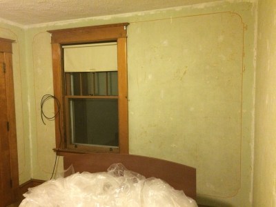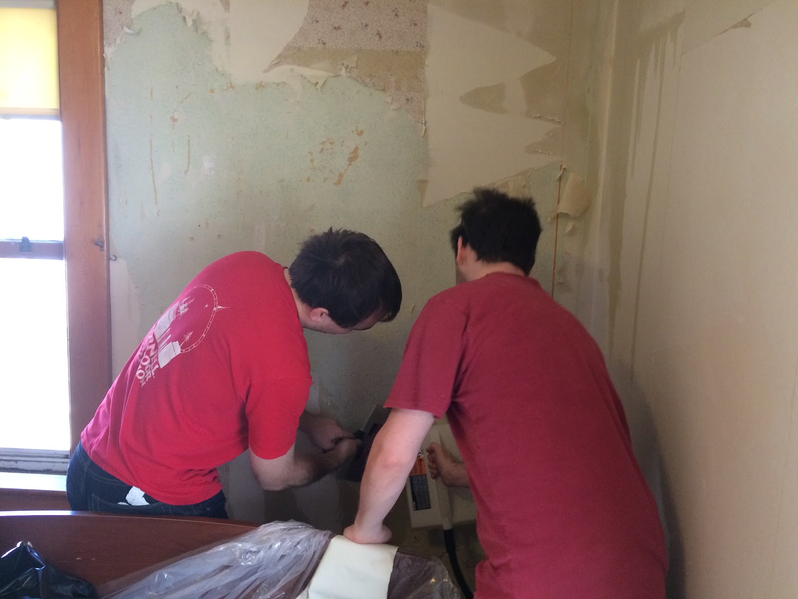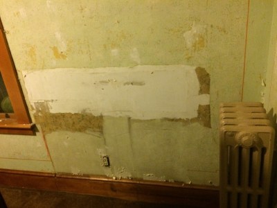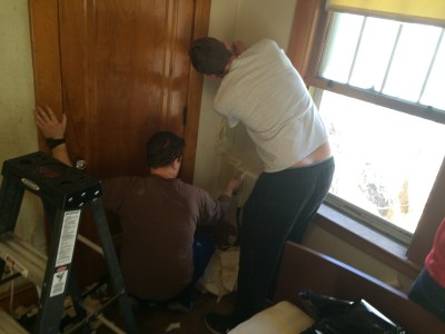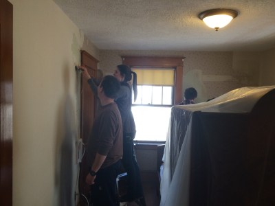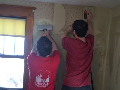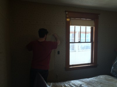 Two weeks ago, we had a number of friends come up for a ski weekend. On Sunday, they said “point us at a project on the house, we want to help.” Ok then! The back bedroom was not all that high on the priority list, but it was the easiest next project for a bunch of people to tackle. So: start to finish, 7 people, 2 hours, all the wallpaper GONE!
