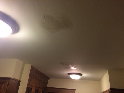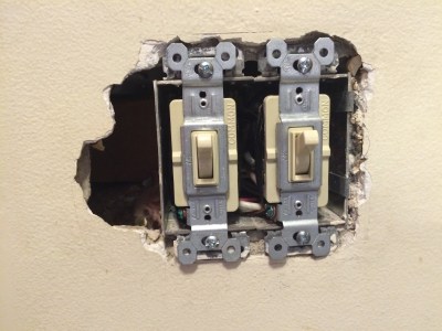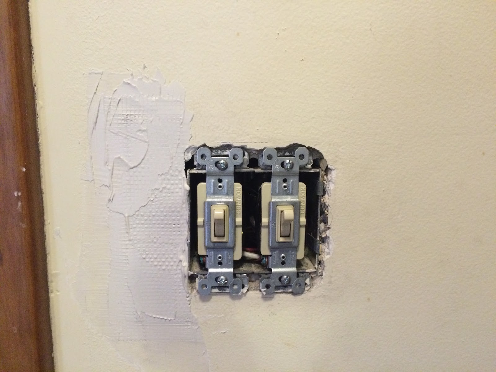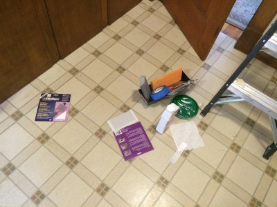 After we rewired the house, there were a lot of holes in the kitchen: four in the ceiling, and then some miscellaneous extra holes – around the light switches, for example, and from the old screw anchors for the old CO alarm.
