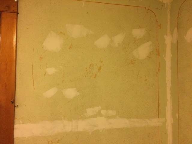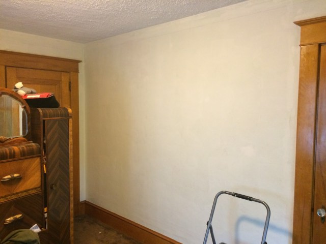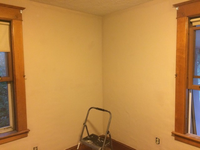 Chiefly, I had to remove the little snagged bits of wallpaper left, and wash off the wallpaper glue. This worked much more easily than it had in any other room. I filled a bottle with half vinegar, half water, and a squirt or two of Dawn dish soap. I sprayed that on the wall, let it sit for a few minutes, and then scrubbed with a sponge dipped in hot water. Rinse the sponge, so on and so forth. It took a few days, doing one wall a day after work, but it wasn’t hard work. I could have easily done it in a day if I had time.