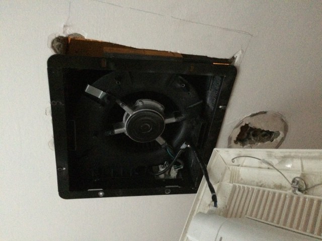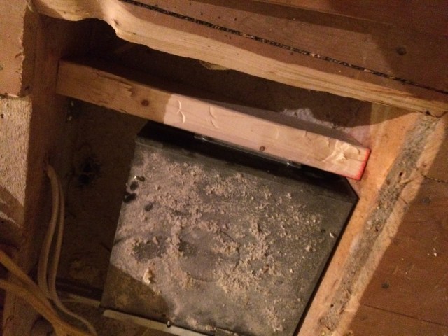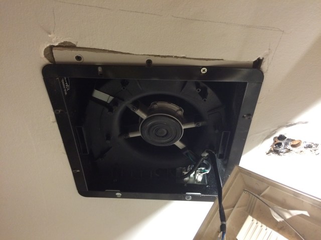 Next step, going back underneath and screwing up from the new piece of sheetrock into the new wood brace. I put one of the screws through the fan itself, though it was already quite secure, just to be extra careful – it was easy enough to just move a screw half an inch to the right and get some extra solidity.