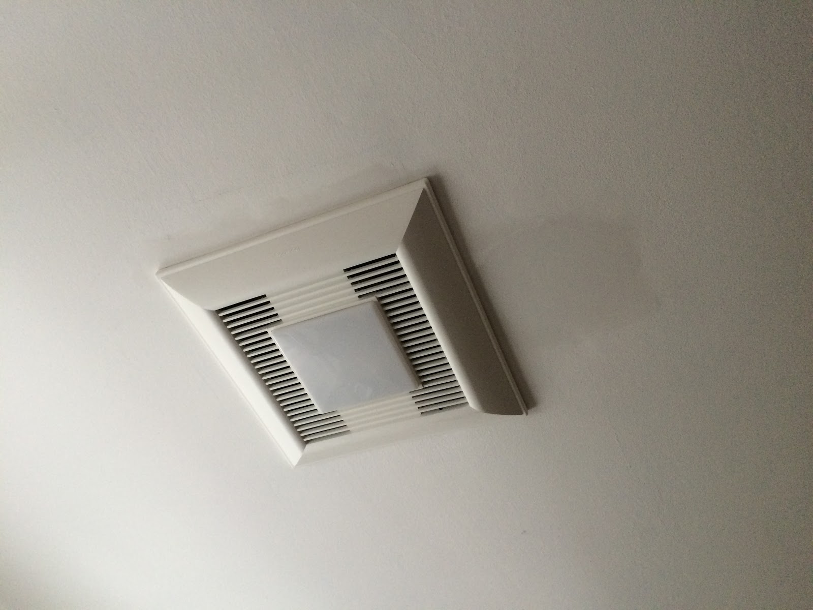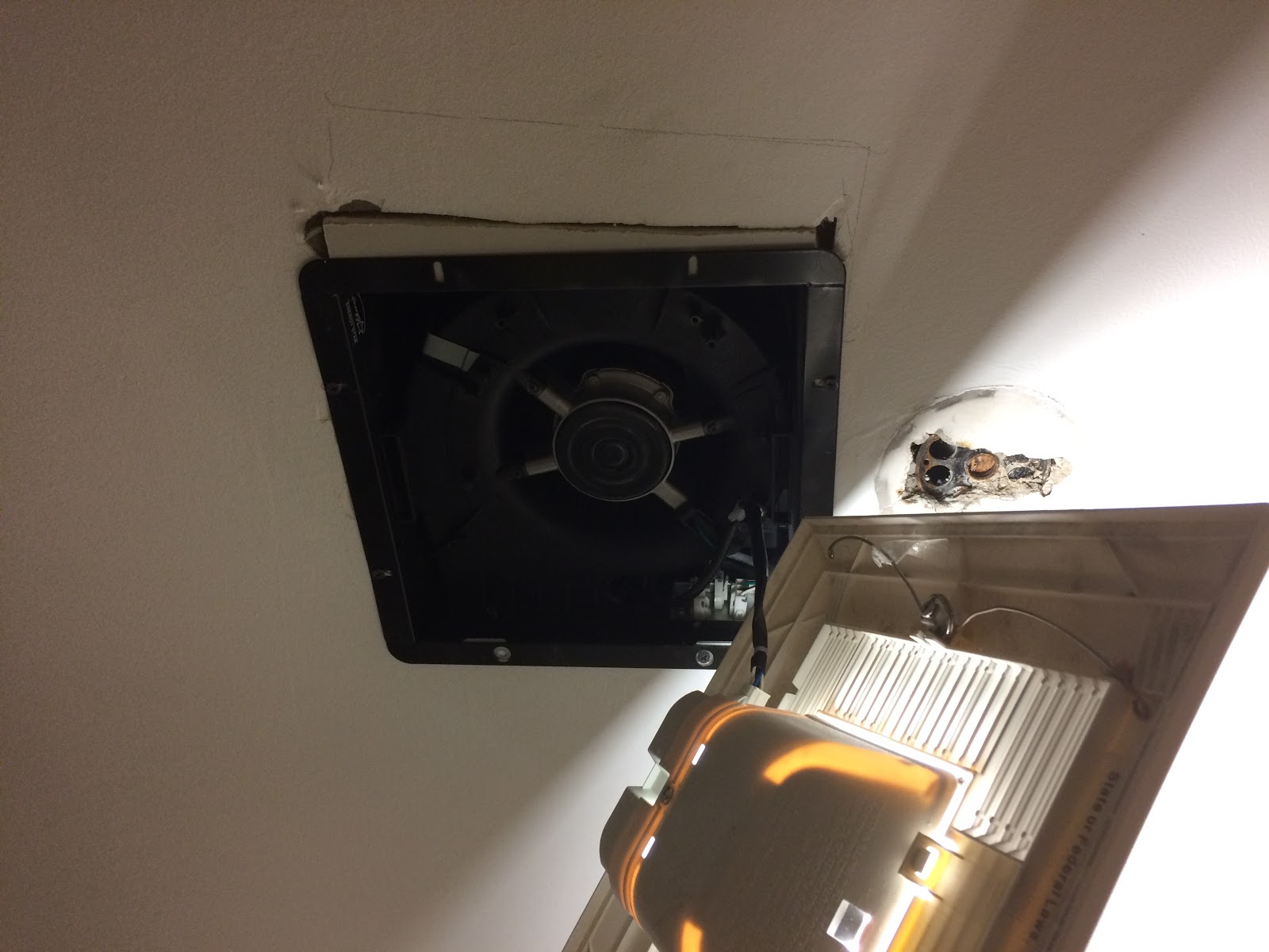 See, when we did the electrical work we wired for two ceiling fans, one in each bathroom. My father and I put the one in the upstairs bathroom in place, and the downstairs one came about months later with the help of a handyman, who also vented the upstairs fan with me.