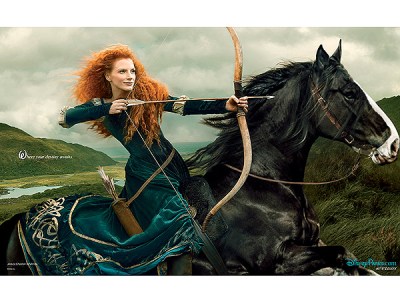 Jessica Chastain cosplaying Merida with a big Shire cosplaying as Angus