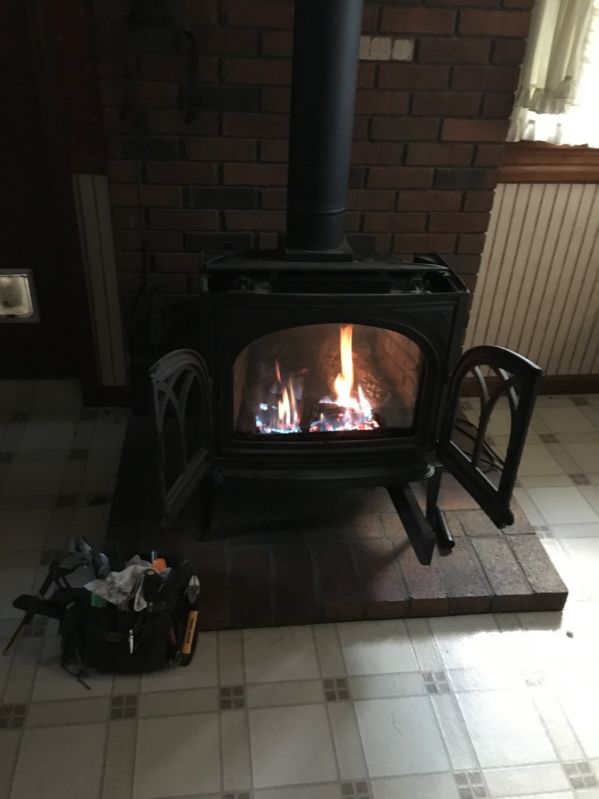 The furnace guy came on Halloween morning, and we added another piece to our heating puzzle for the winter: bringing the gas stove in the game room back online. There’s no heat essentially in the back half of the first floor – kitchen, bathroom, game room, man cave. I think when the previous owners renovated the kitchen, they took out a radiator – based on what I can see of the pipes & the leftover radiators we have.
