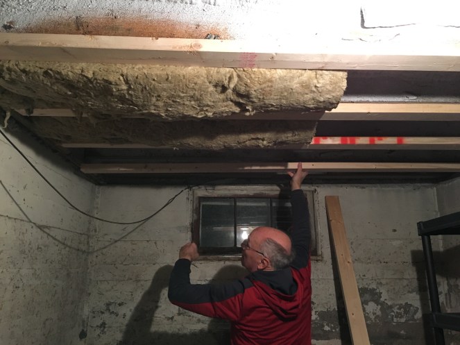 The first challenge was something my dad took care of: in one section of the basement, there were 2×6 beams instead of 2×8 beams. Why? Who knows. Reasons. It meant that before we added in the strapping, we had to basically add 2″ (actually less than 2″ because no one labels wood in its actual size WHAT IS UP WITH THAT?) to have something to attach the strapping to.
