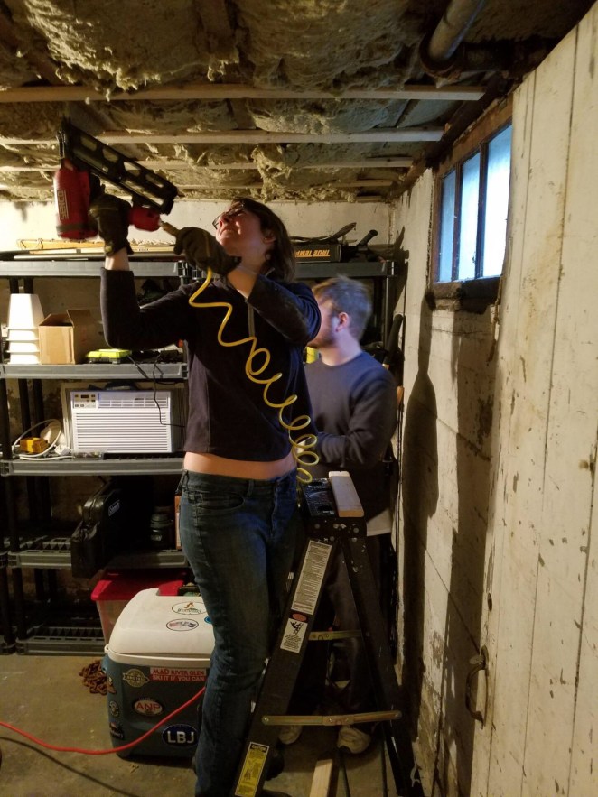 It’s actually a fairly straightforward process. Just grunt work. Occasionally difficult to reach up and hold for that long, but then you just have to use the nail gun and bam, it’s in. Once we get into a rhythm it’s pretty fast. The downside is that I can’t do it by myself, so I have to wait for my husband to help me, which means it’s part of a larger set of house project negotiations and I can’t just do it on my day off.
