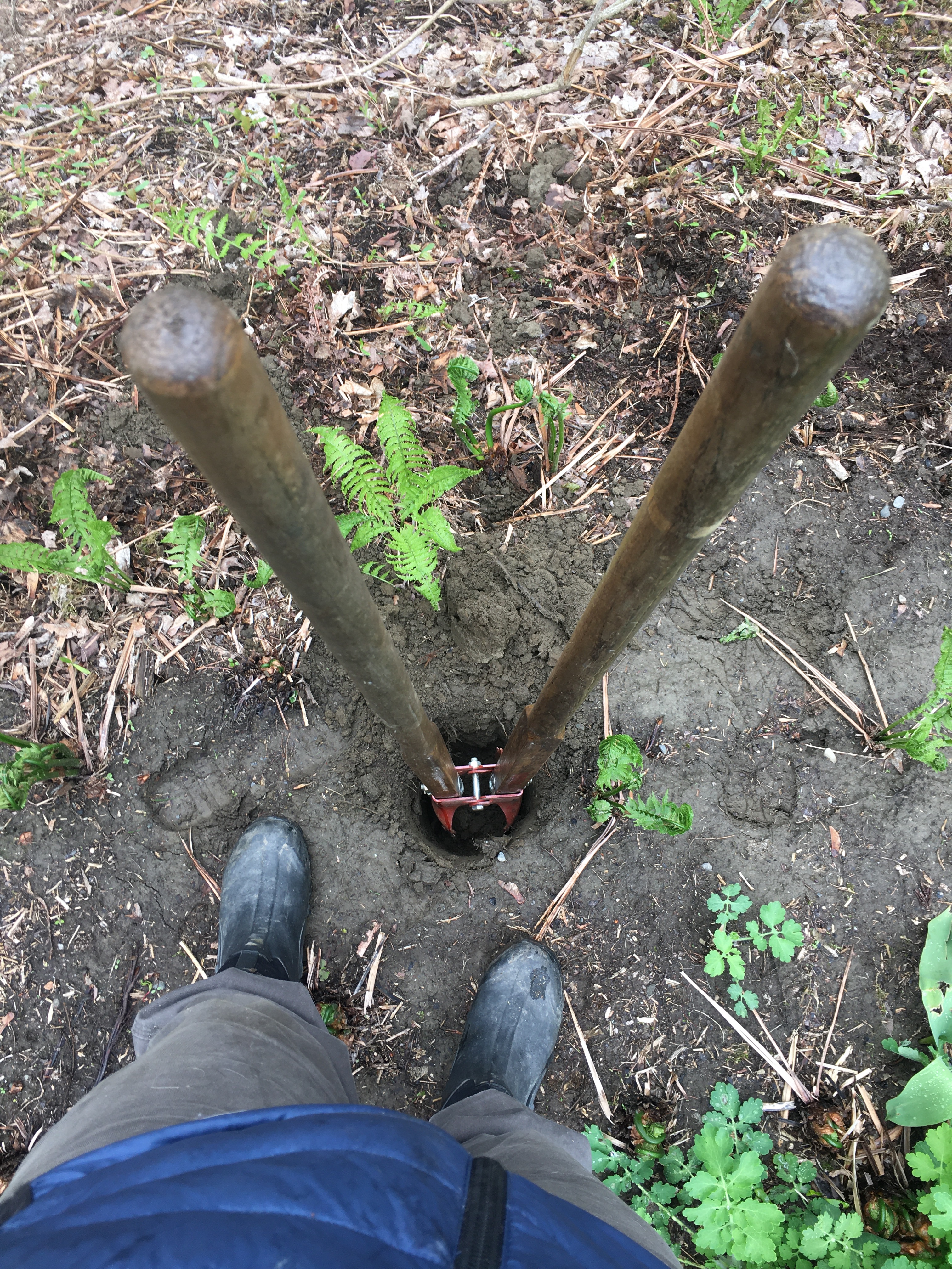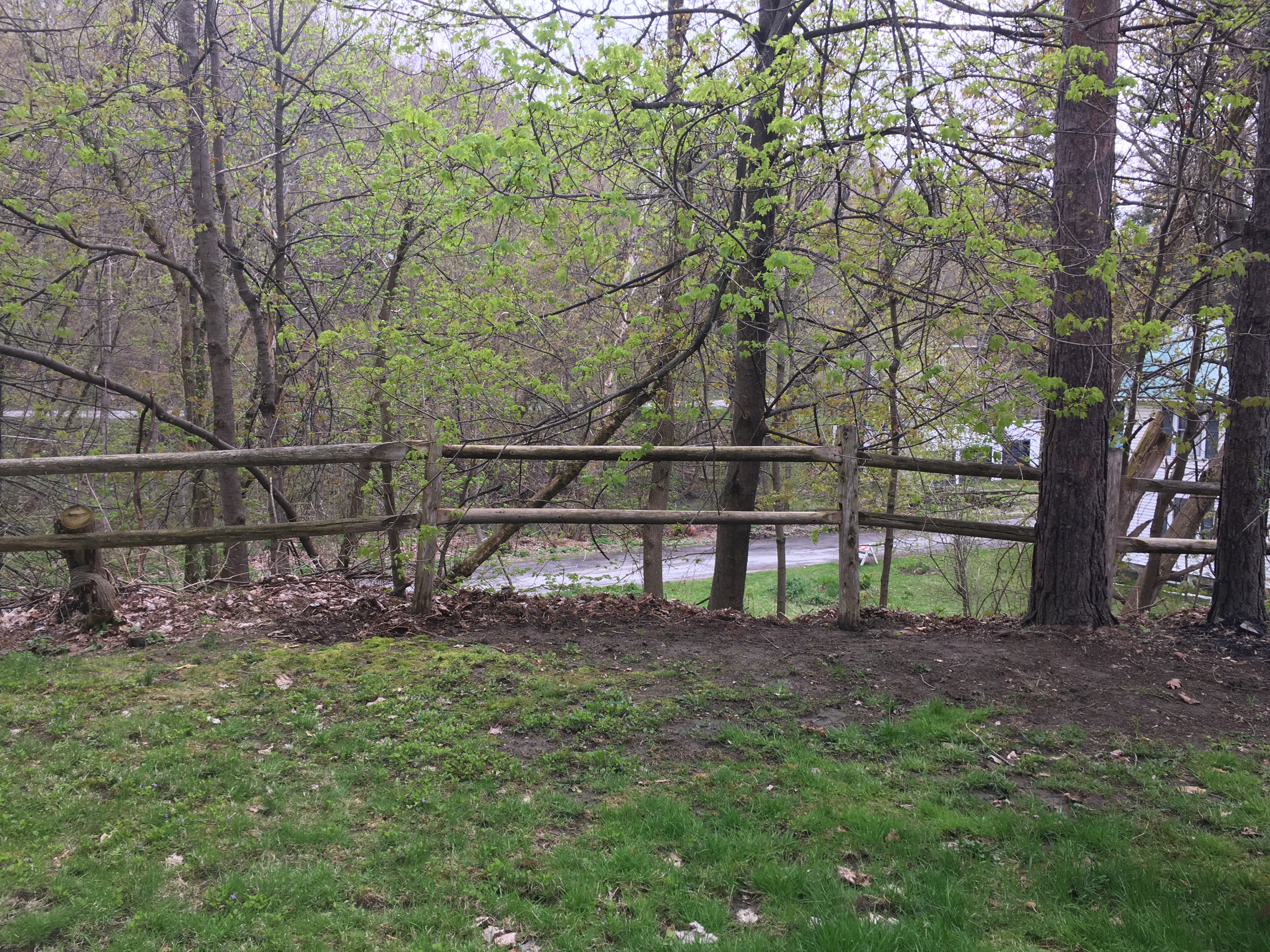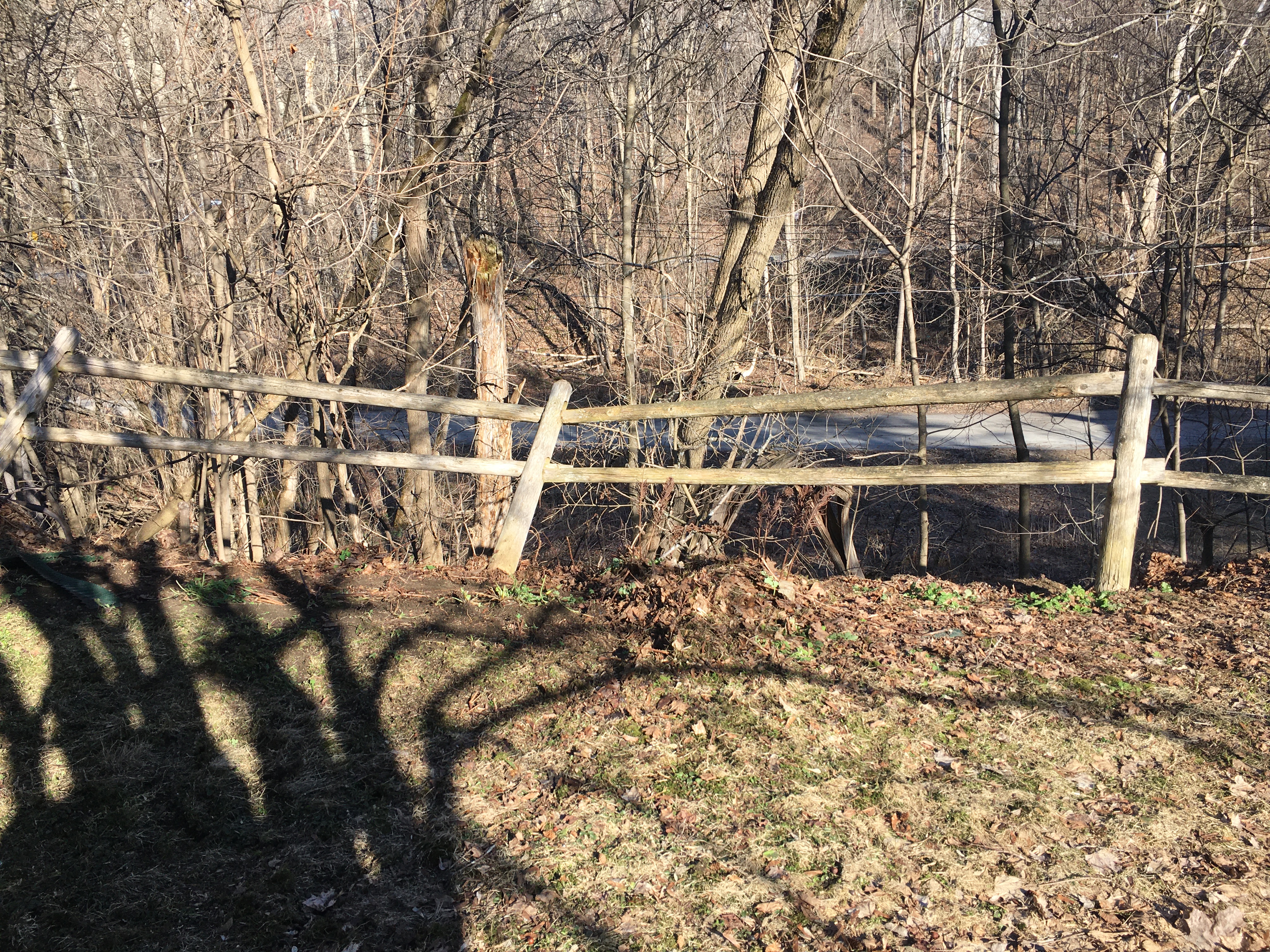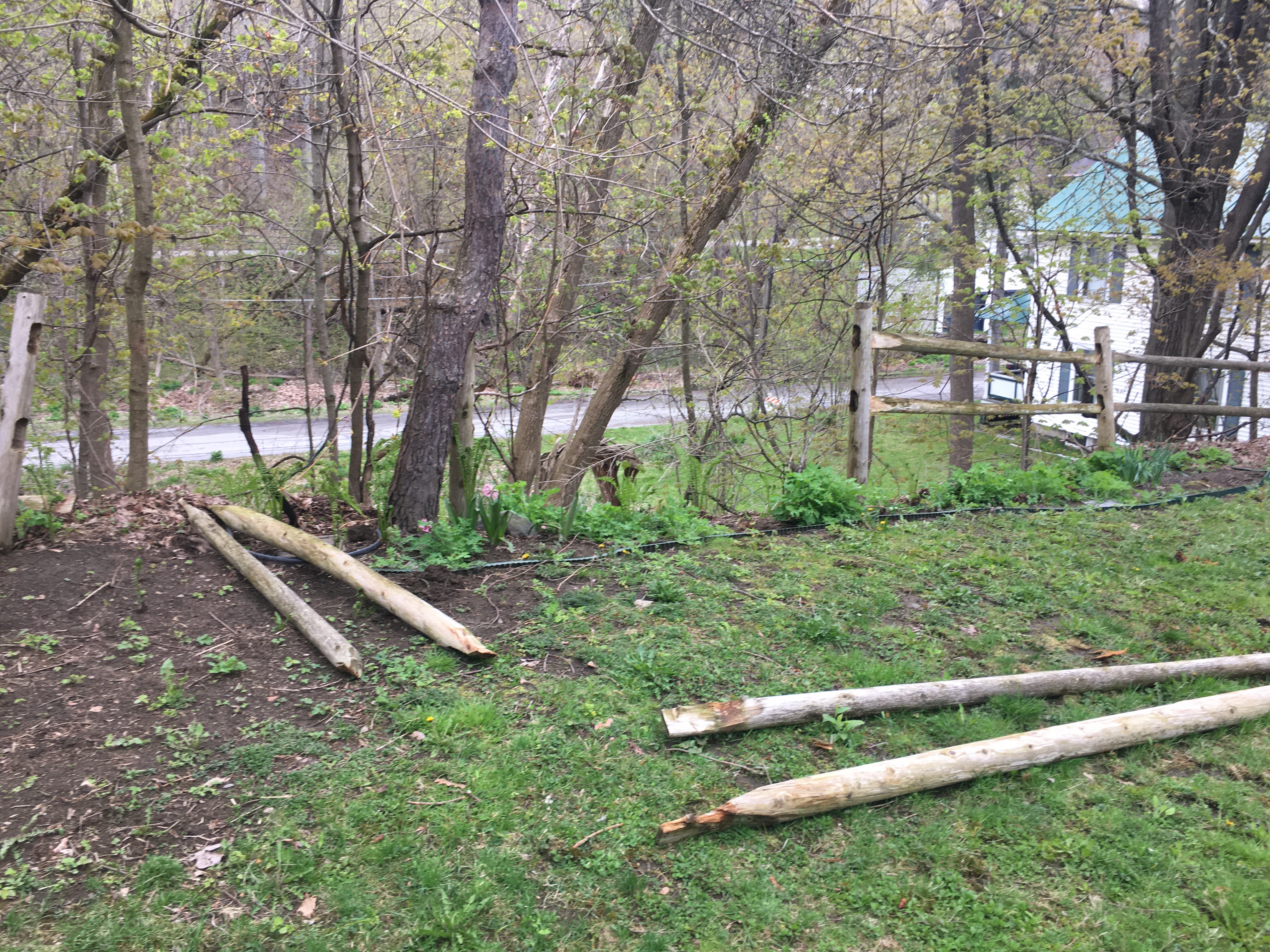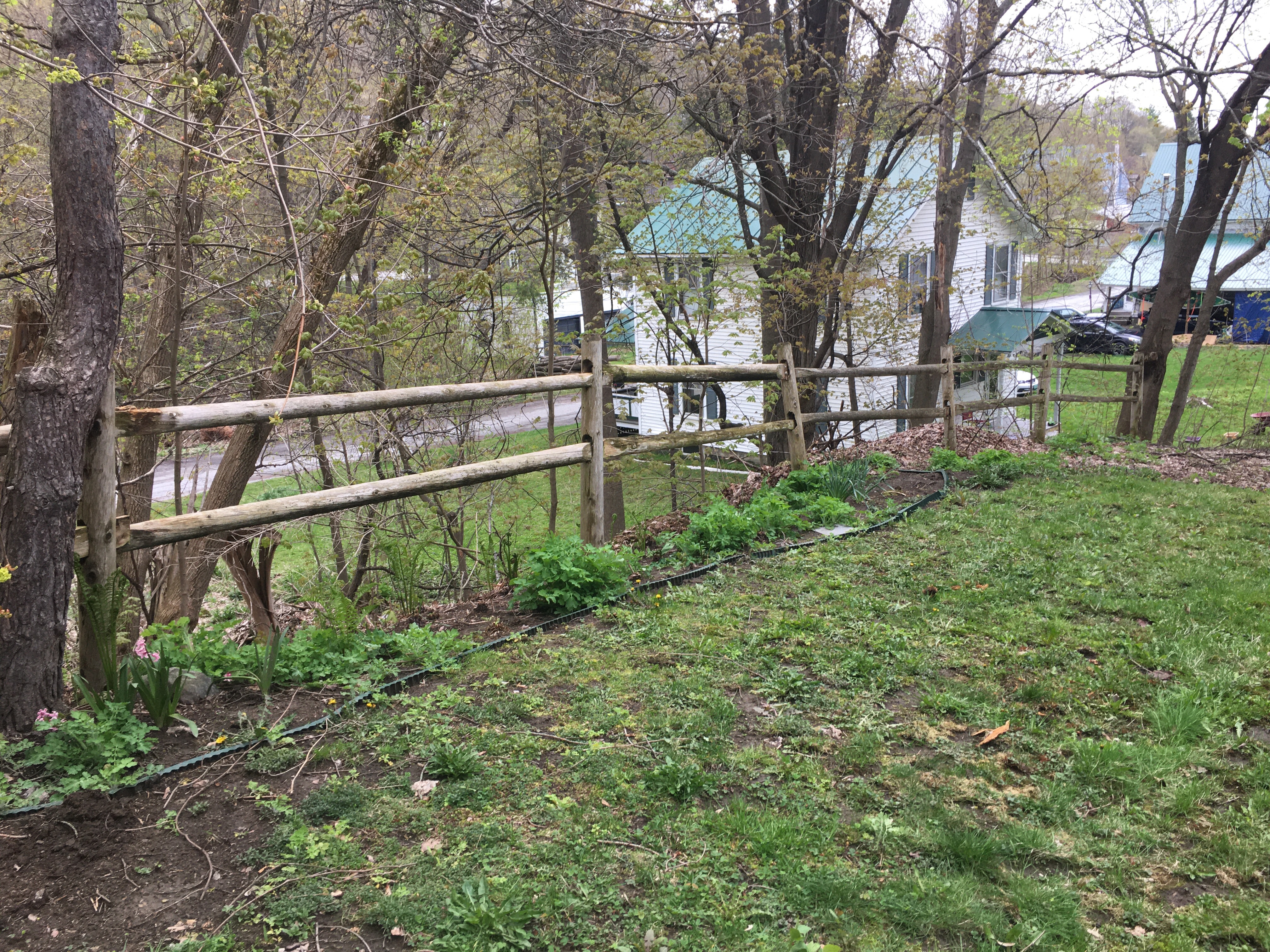 Then, see that fence in the background? It edges the yard and delineates the drop off for a quite steep hill down to a back quarter-acre lot that we also own and let run totally feral. It was in really tough shape. So we got a post hole digger and re-set several pieces of it.