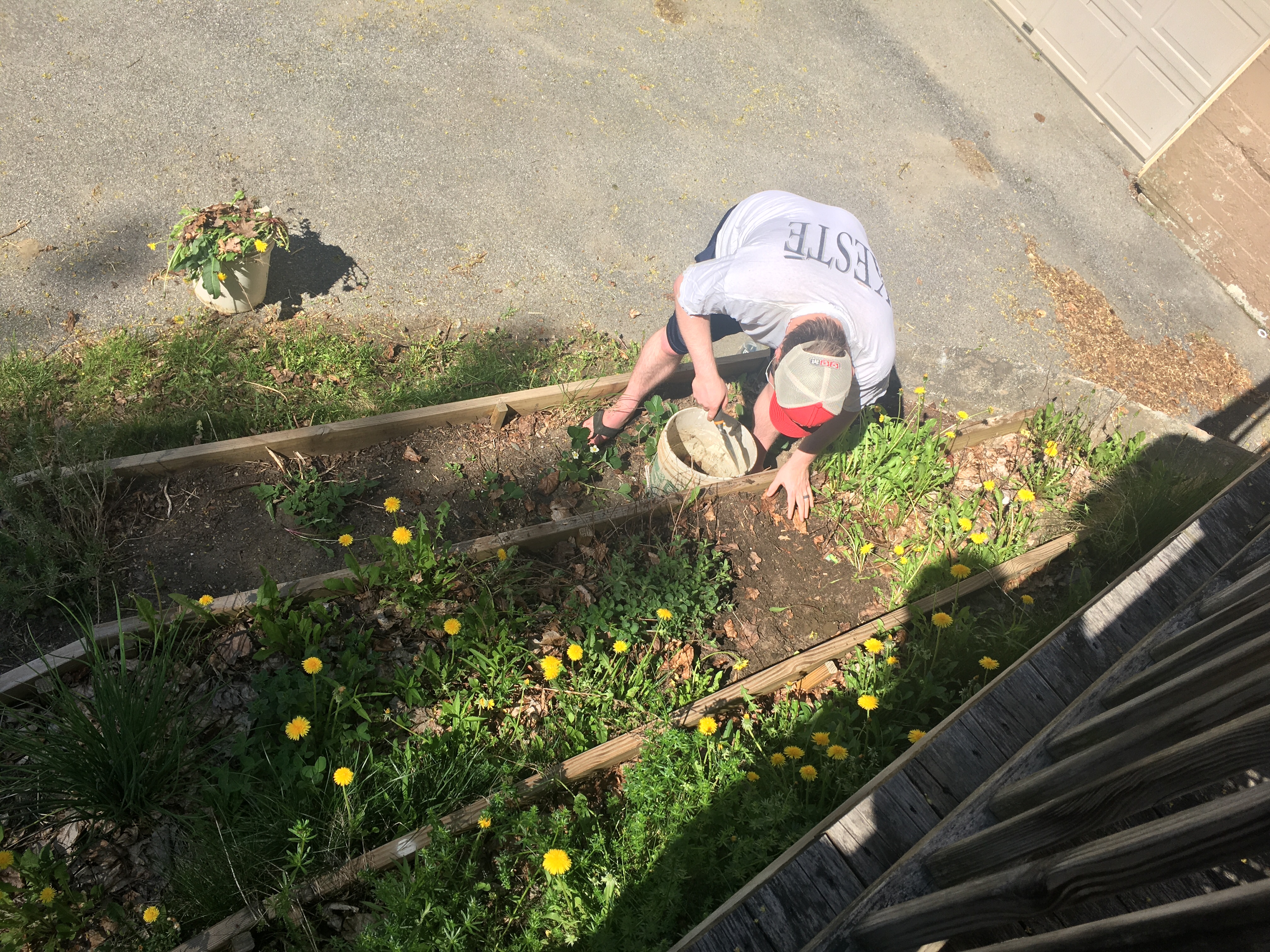 And last but not least we had a fairly epic job of weeding to clean out & plant various garden plots. No photos of planting because I left my phone inside but here’s my husband weeding the herb garden.