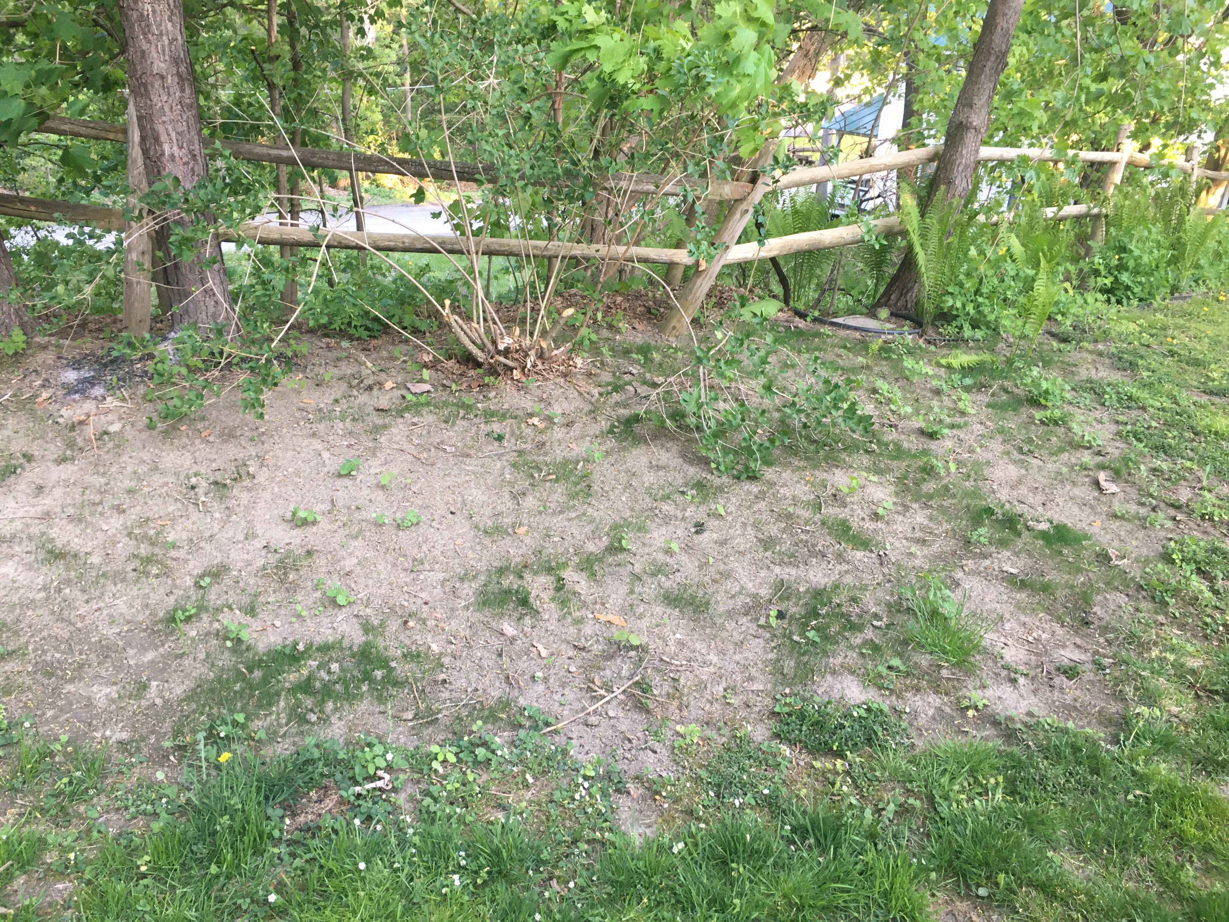 First: cutting waaaaaay back on a rogue forsythia bush and then rucking up and replanting the soil around its former base so it’s part of the yard again. The grass seed has caught quite nicely.