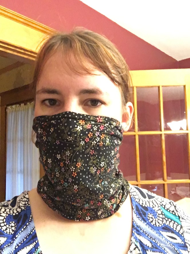 I’ve experimented a little bit lately with making my own gaiter-style face coverings, for times when I’m exercising and/or need to pull it up and down more regularly than a tied or elastic face mask. So far, I’m pretty happy with it! The fabric I like best is sweat-wicking and light enough to breathe through, but substantial and stretchy enough that I’m definitely not letting air “escape” around the sides.
