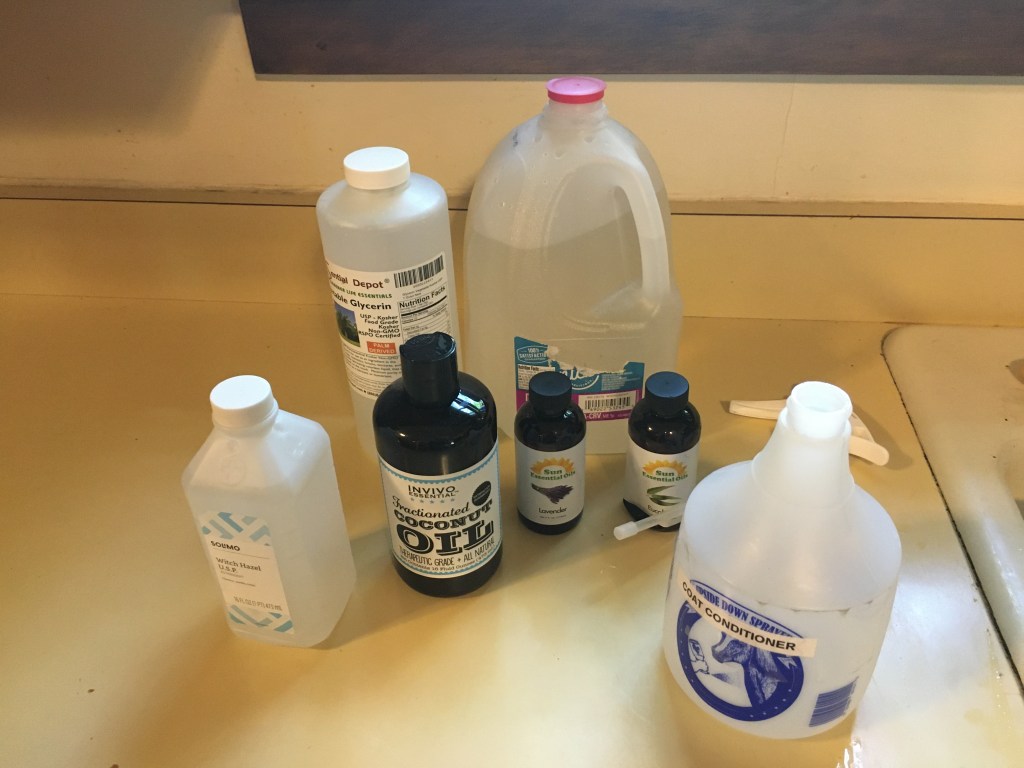 So, here are the ingredients that Liz suggested, along with my spray bottle, purchased for this occasion because I seem to be one of those people who never has a free spray bottle. The hardest thing to find was the distilled water, which I ended up locating at a drugstore. Everything else I got on Amazon for about $50 total.