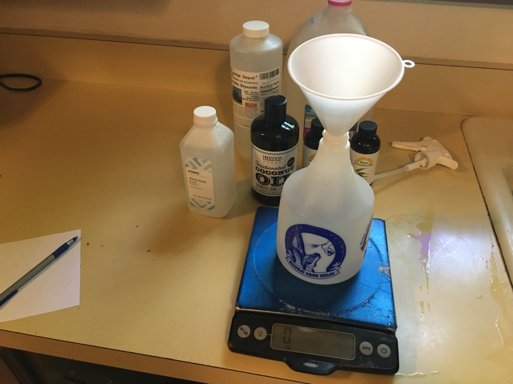So here’s the recipe by weight, in case you want to do it that way. You can easily double it to fill a 32oz bottle. I love doing things by weight – I bake by weight almost exclusively. It’s a way to do easy math to double, to
