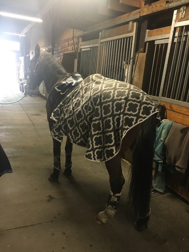 Thankfully, it did pass, and I was able to walk over to sit on another mounting block outside and get a bit of a breeze, then take my helmet off, and the BM – having longed Tristan into a lather – put him away. She confirmed that his little stunt had been incredibly dirty, which made me feel better a bit. Someone brought me some water, and that helped, and gradually over about 30 minutes I started feeling much closer to normal. I checked in on Tristan, rubbed away some of his sweat, noted his utter lack of apology, gave him some treats anyway, and drove home. I took a whole fistful of pain meds and a three hour nap, and then took it easy for the rest of the night.