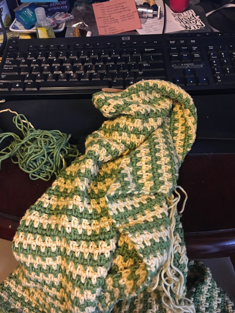 Not strictly speaking house work, but I’ve pulled out a few UFO crochet projects to work on while WFH. This blanket was (is?) a wedding gift for my brother, whose oldest child just turned five. So, long overdue. I’m about halfway through it now. I have to sit in on a fair number of large statewide committee meetings for work and I just turn my video off and listen and crochet away.