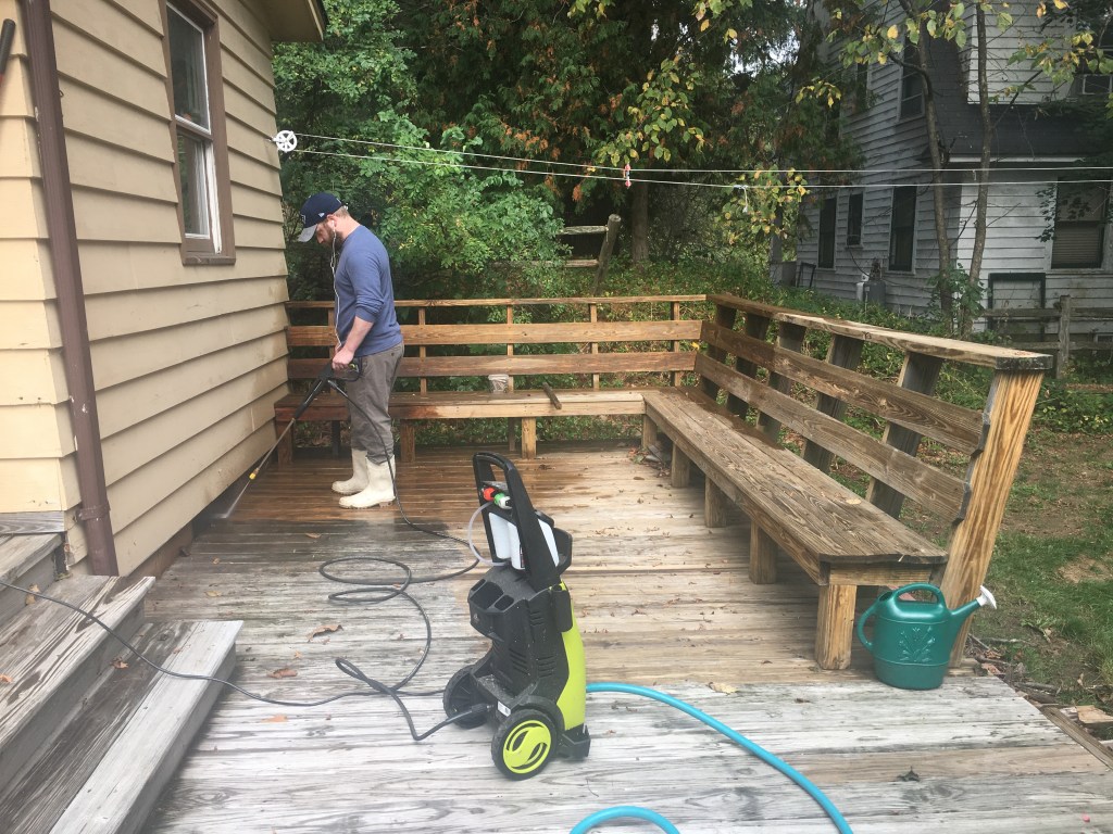 Over the summer I impulse-bought a pressure washer and my husband did about half of the deck. You can see the difference pretty clearly. The plan is to do the second half this summer and then re-seal the whole thing.