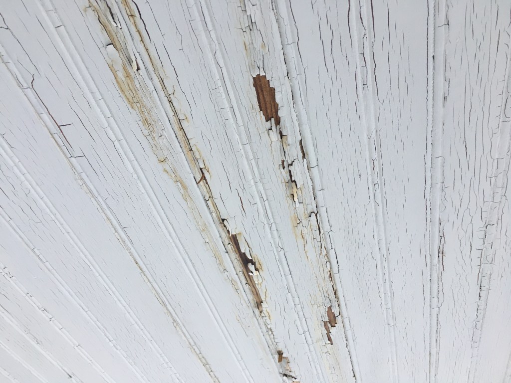 Finally, the easiest problem: some cosmetic upgrades. Right now, the entire interior is painted white. Because of its weather and temperature exposure, that paint is done. There is some evidence that the original wood was stained and covered with poly, based on this water stain in the ceiling.