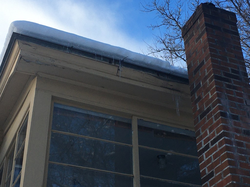 I took this photograph a short while ago. If you look just behind the chimney, you can see the problem immediately. Yes: those are icicles coming down behind the trim. It’s not great. It’s hard to tell what the problem is, exactly. Is the roof actually failing – perhaps at the top, where it connects to the main roof of the house – and the water is getting in up there, traveling underneath the roof, and then out behind the trim? Or is the water hugging the edge of the roof and wicking up and behind the trim because the paint flaked a little bit?
