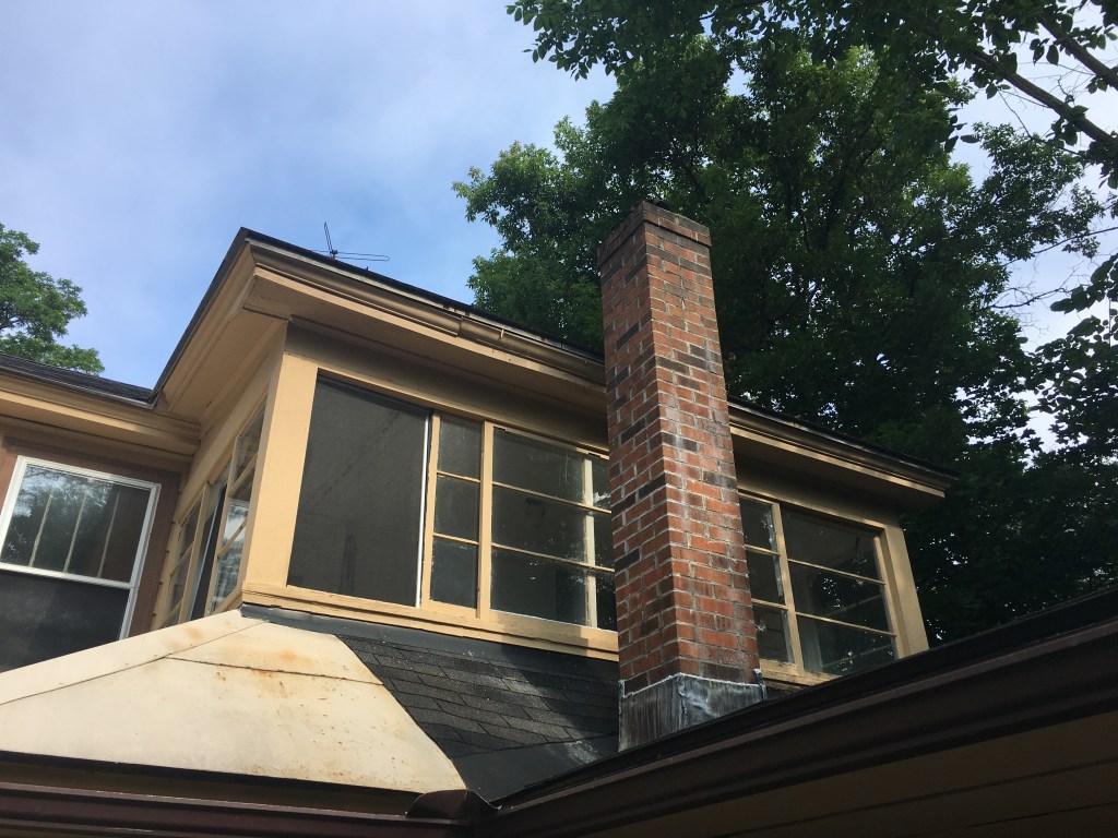 Here’s one sort-of in progress photo. It’s been POURING all weekend, so the contractor just did a little bit of opening it up and a lot of measuring on Friday. You can see that he took off the fascia trim to make sure he was matching it, and also get a sense of what was underneath the roof itself. It doesn’t come through in the photo, but there are – no exaggeration – at least a dozen wasps’ nests underneath the roof. YIKES.