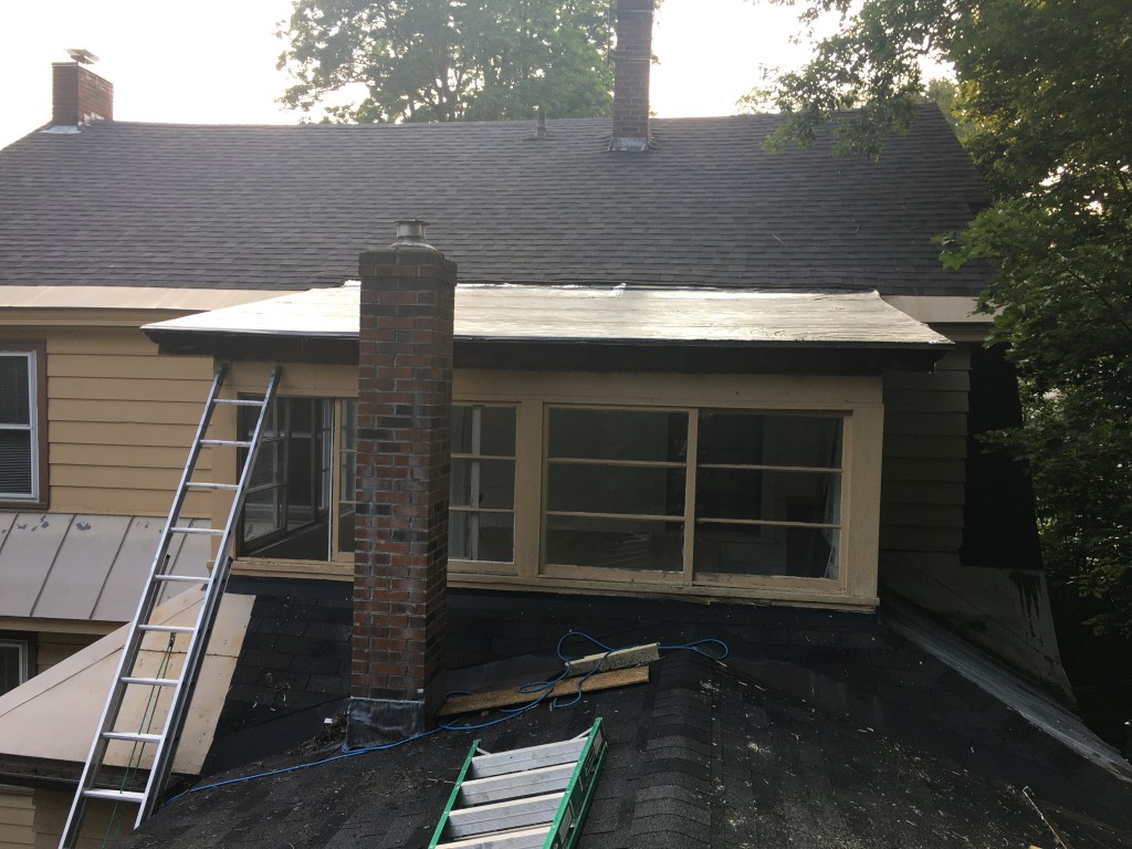 Actually, turns out, removing three old roofs. Yeah. There were two other layers of roofing underneath that top standing seam metal roof. FFS. Another layer of stamped tin and another layer of verrrrrrry old asphalt shingles. So all of that went! Back down to the joists, and then starting over with proper new sheathing and proper underlayers.