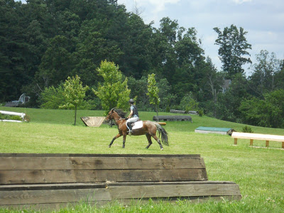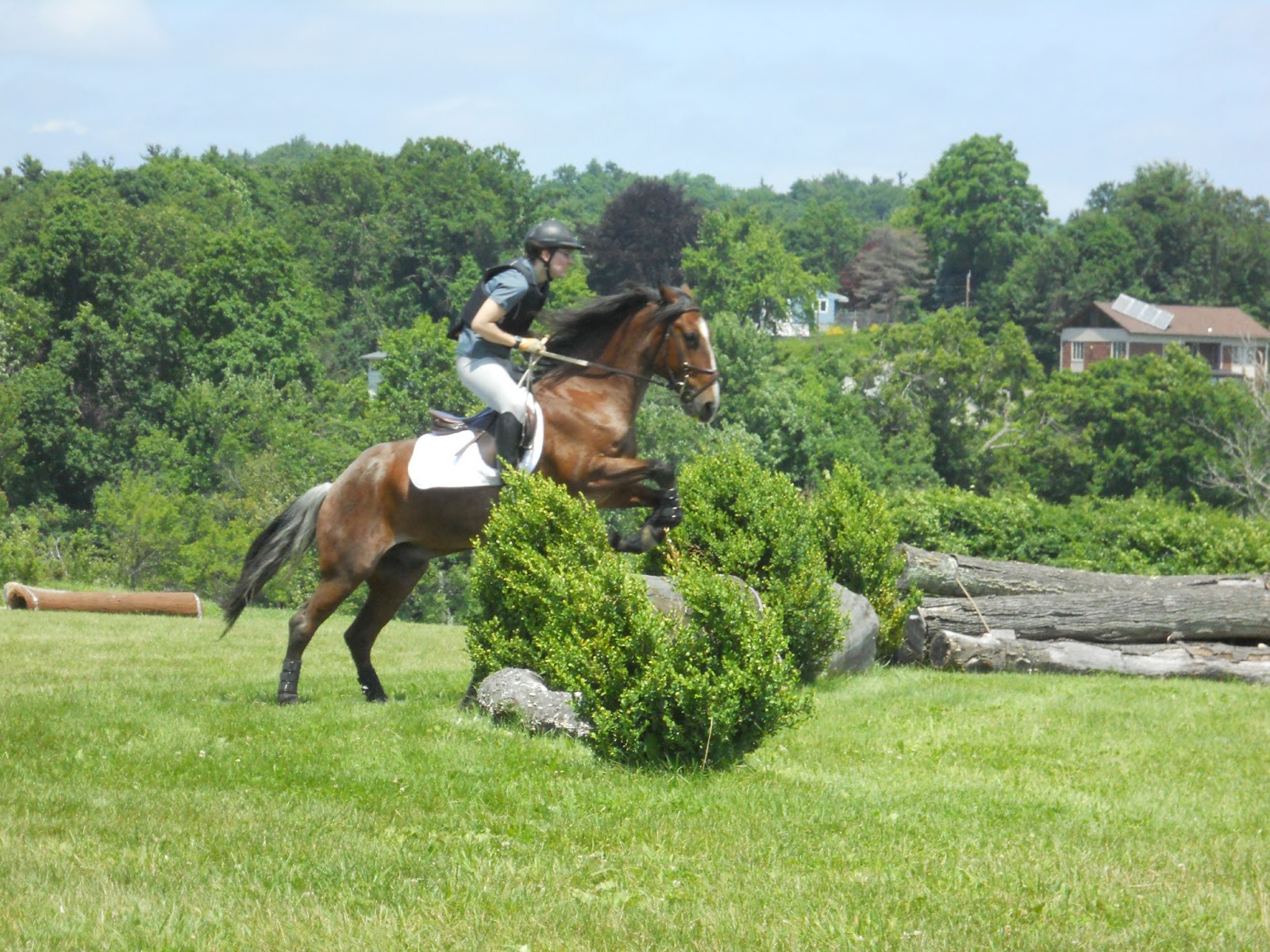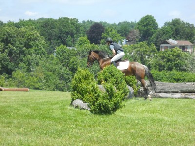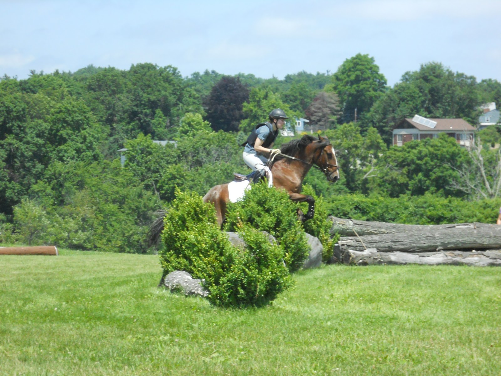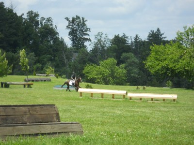 I brought my camera, but was too busy suppressing my gag reflex to take pictures, and there are no pictures online that I can find, so a verbal description will have to suffice. First jump was a nice, inviting big log uphill, and then a turn left to a bit of an airy three-log pyramid on a fenceline, with a bit of a downhill on the landing. Curve left over a little barn-like coop, and then land and turn right and a bit of a run across the field to what I think was a maxed-out rolltop. This was the first jump of any size and it was the one that I was most worried about. Land from the rolltop and enter the woods, then go left through a gate and over a tiny little ditch. Continue along a trail through the woods, turn a hard right and go down a bit of a steep, rocky, hill, at the bottom of which a sharp left loop and over an open log fence of some size – basically another log coop with zigzag logs across the front. Come out into the back field for an option: big, almost Novice-sized flat-topped coop or a smaller adjacent one. Curve right uphill for a cute little brush fence, and then downhill again for a solid red coop. Through the woods, curving left, and out of the woods off a small drop with a downhill away back into the field, then a hard right back into the woods, up and out the other side and turn left over two related fences, both hanging logs – I believe four or five strides between. Through a bit of a tree line, and down a steep hill into the water complex, which is gorgeous, but we were only doing a mandatory crossing. Cut left after the water to come up around a hill to the right, for a little red bench, then left over a rock pile topped with a log, then uphill over a cabin for the final fence.