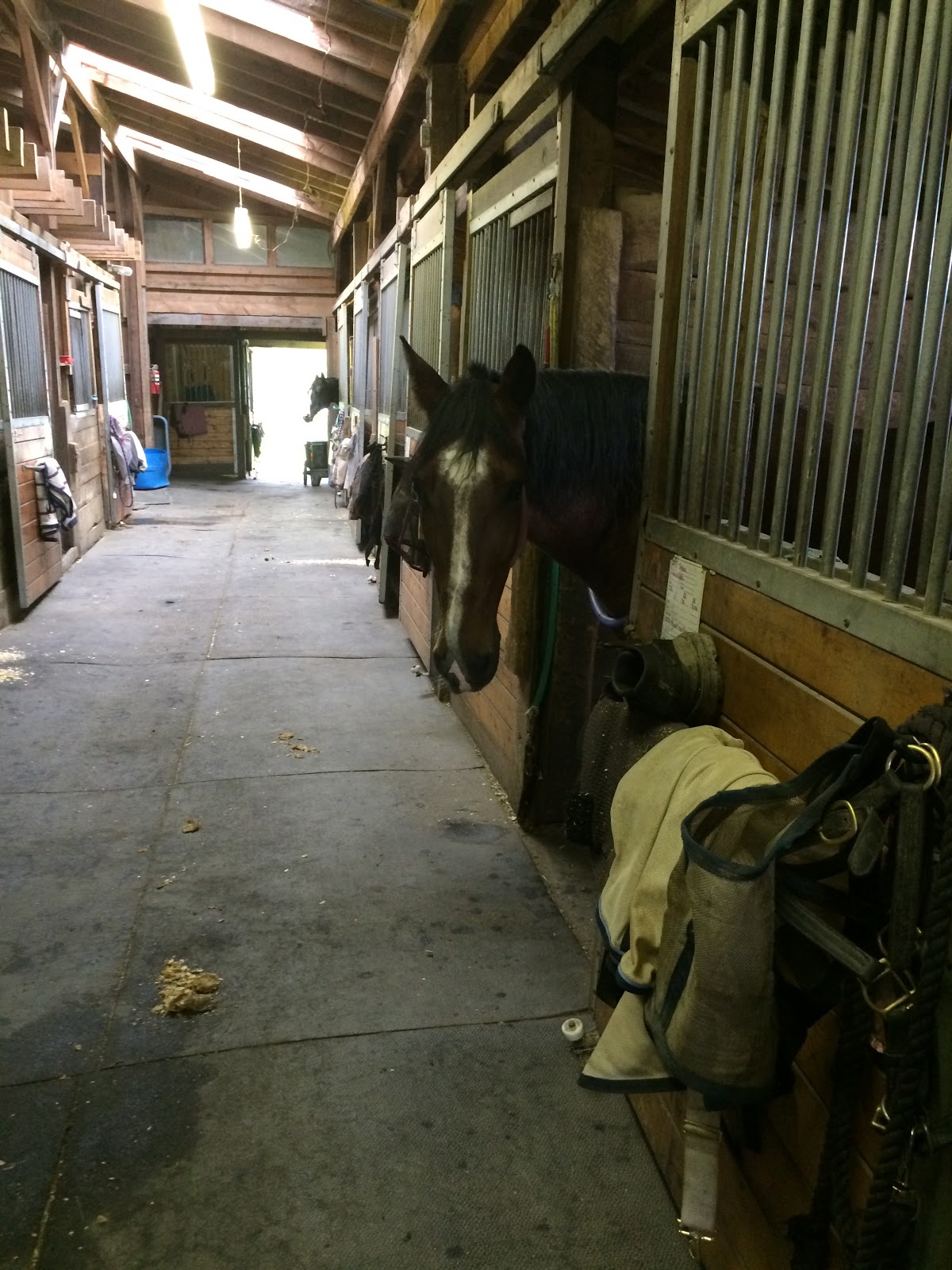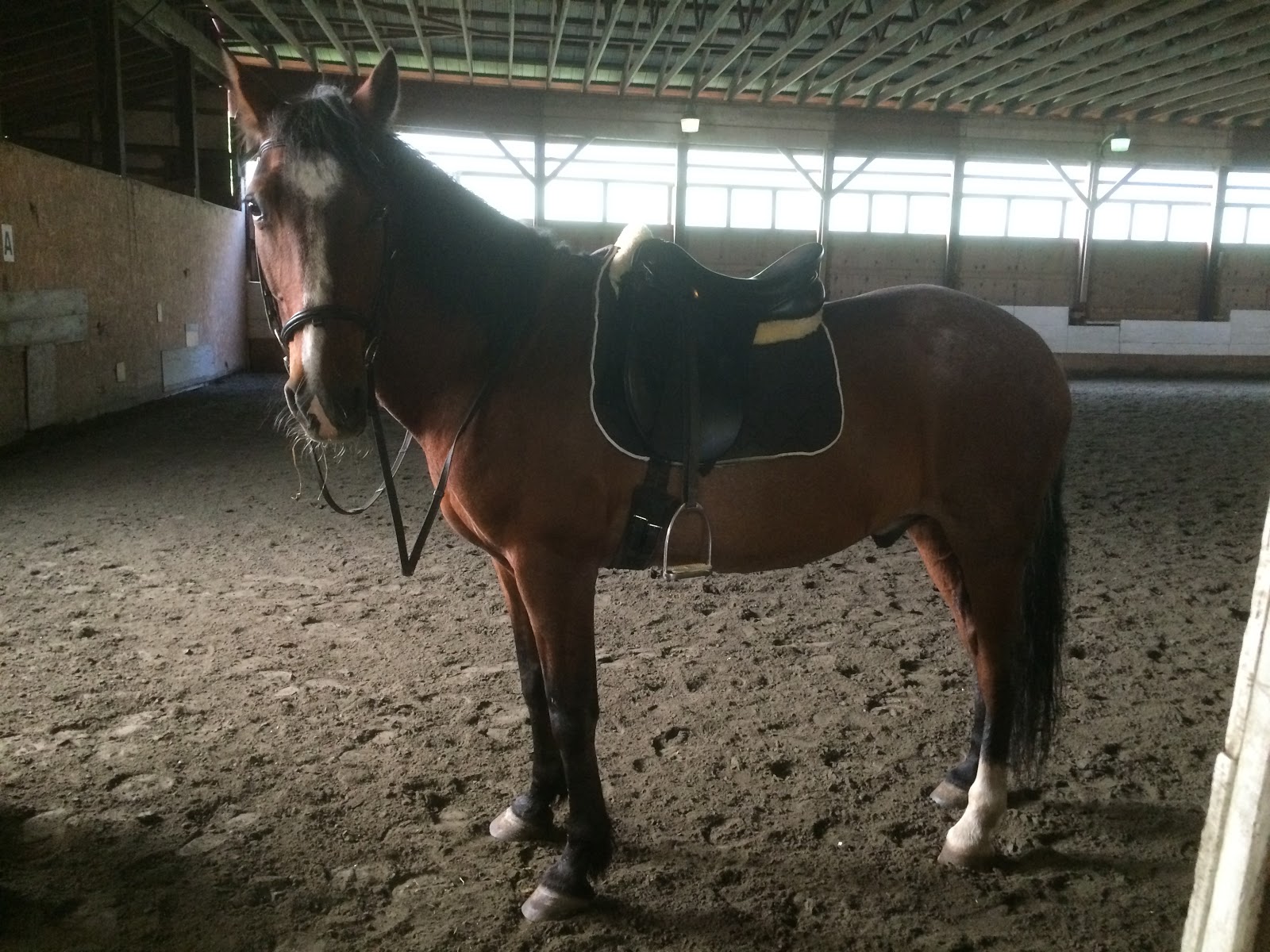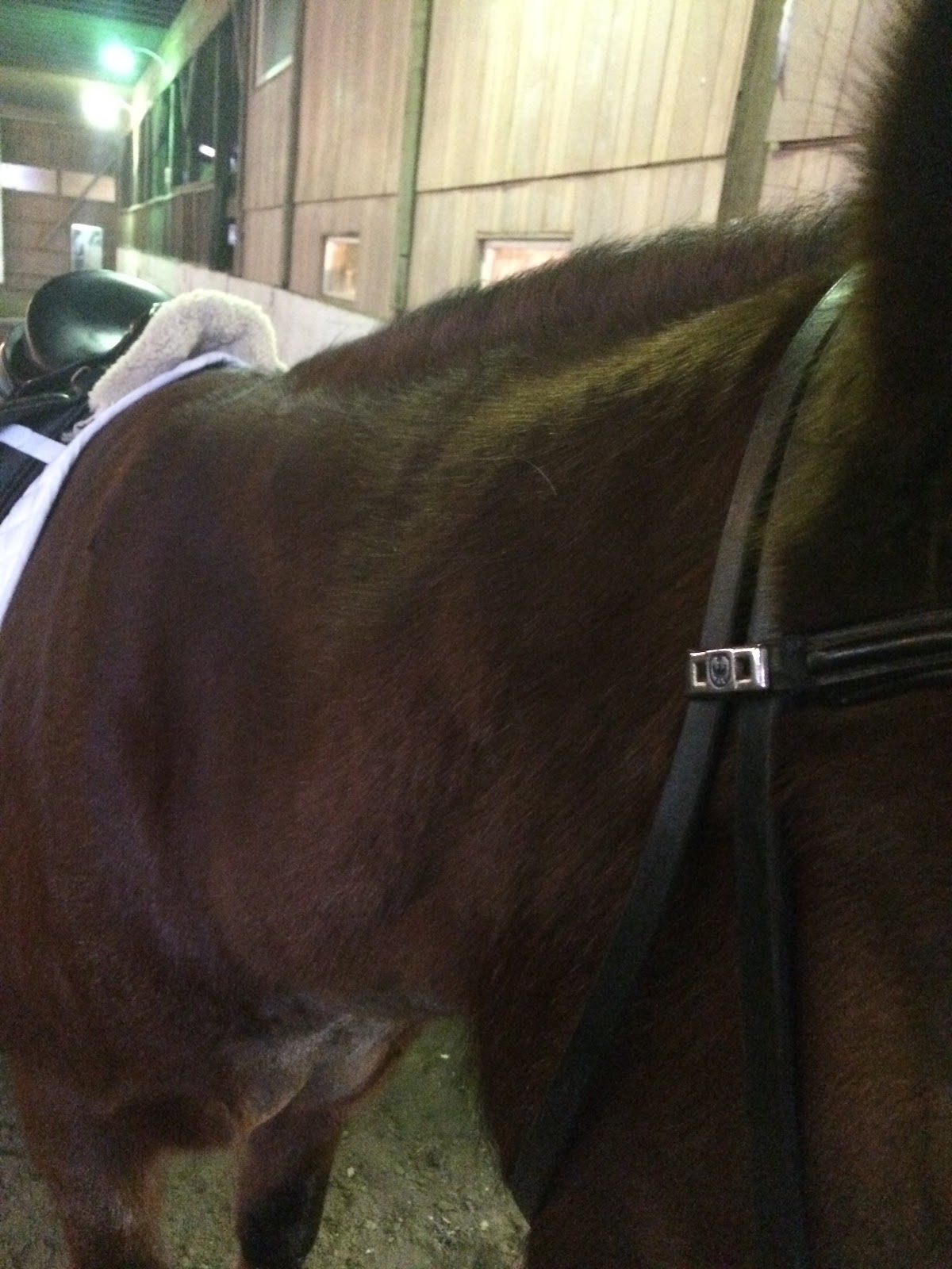 Nothing jumped out, so we picked up the trot, and he felt great. More even, more solid than he had at the walk. Basically 100% normal, if behind the leg and fussy in the bit. (So, normal.) We did about 8 minutes of just stretching loose trot around the entire indoor, with only an occasional 20m circle. Nothing dramatic, just keeping him moving and getting him warmed up.