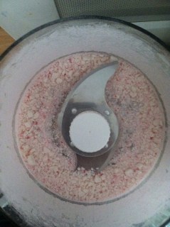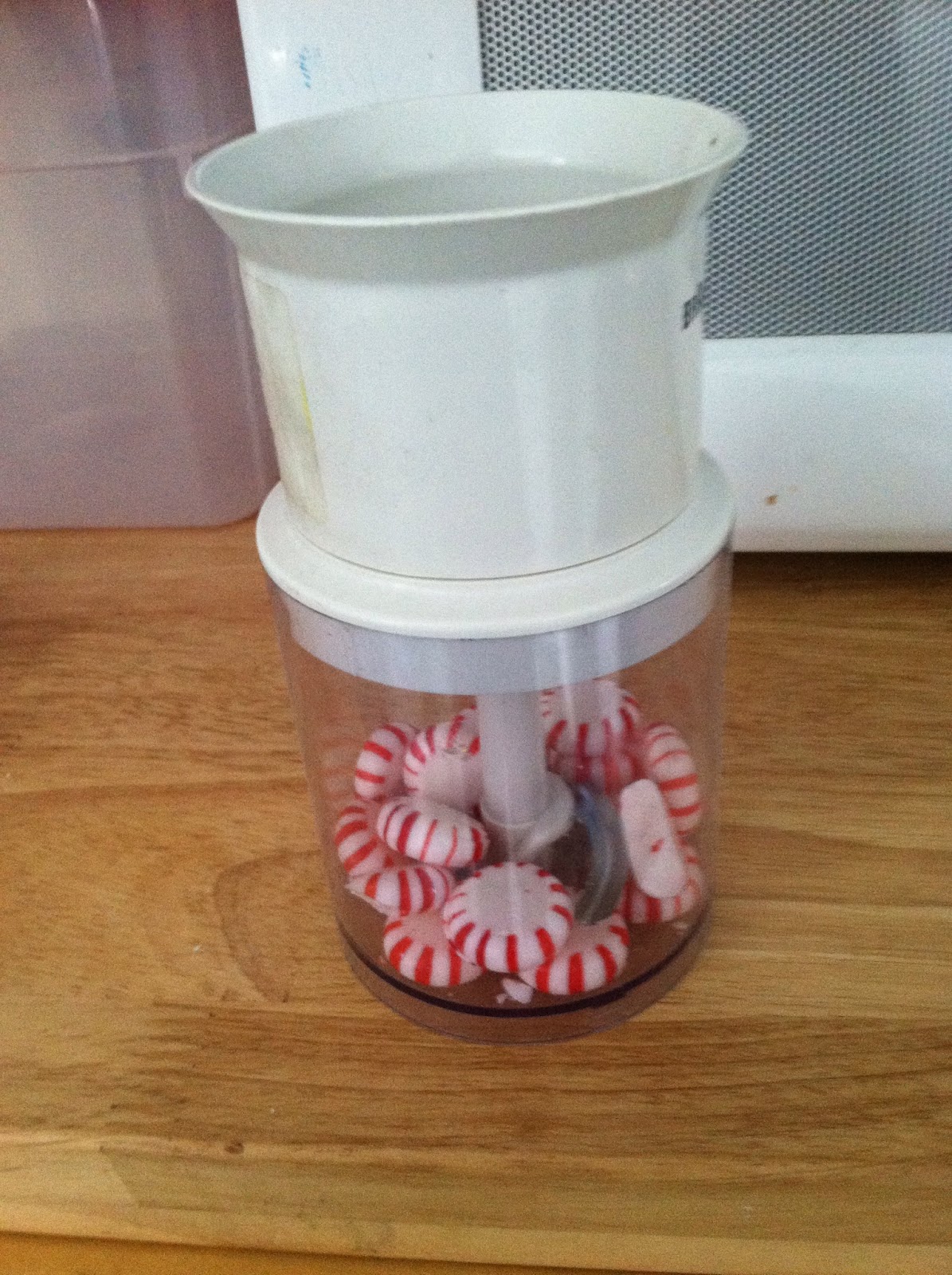 I first tried crushing the peppermints with my immersion blender’s processor attachment. No dice. It wasn’t nearly strong enough; it mostly bounced them around and chipped them a bit. Duly noted.