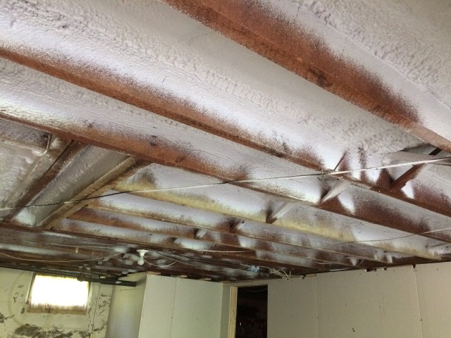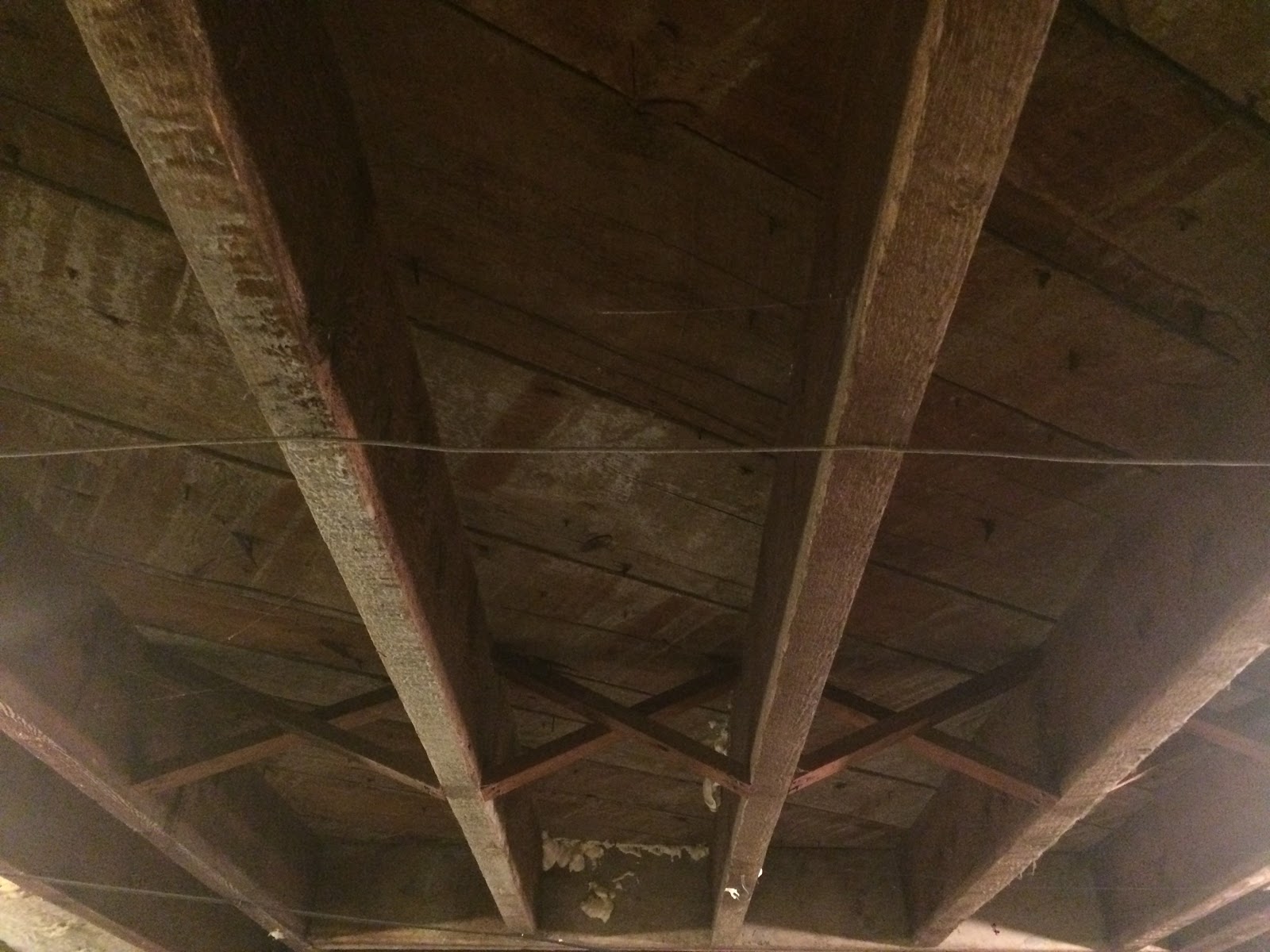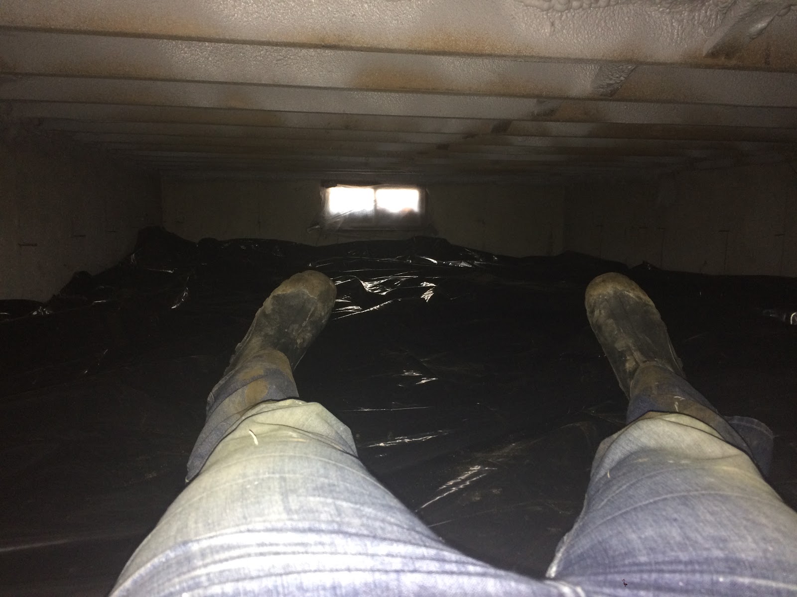 The next step was spreading a 6mil barrier over the dirt: this would keep any moisture from coming up and into the man cave above. We know this had happened quite a lot in years past because when we took out the tile that had been on the floor, there was no glue left holding it down. Moisture had come up from the ground, through the beams, and dissolved the glue.