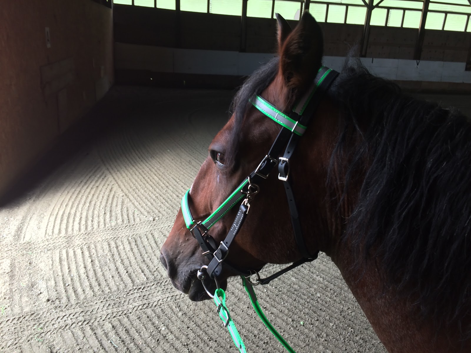 I ended up ordering the black base, with lime green day glo overlay. I chose the Horse size bridle – Tristan is often a fairly true horse size, and the range said it ran from 14.2 to 16h horses, so seemingly on the smaller side. I went with the stainless steel hardware and matching reins, and chose the roller buckle attachments for the reins because I prefer them whenever possible. I didn’t go with a breast collar or curb strap, and chose white stitching because I thought it would be a nice contrast. (So, basically, I bought the exact same bridle that the model horse is wearing.)