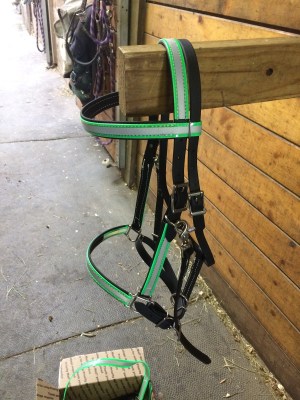 So, step 1: ordering. Like I said, an unbelievable array of possibilities there. It took me quite some time and hemming and hawing to finally decide on what I wanted. I chose the Traditional Halter Bridle made with Reflective Day Glo Biothane. I opted for the reflective biothane because I primarily envisioned this as a trail riding bridle, and I wanted something really obvious for hunting season. One tiny quibble: there was no true hunter’s blaze orange among the reflective options. (Or at least that wasn’t clear; there was an orange but I couldn’t tell if it was blaze orange, so didn’t choose it.)