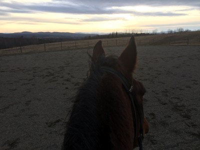 We picked up a canter for a little bit, which was really more straight up and down than actually workmanlike. Plus, it had that edge of potential bolt at any moment, especially directed toward the barn. But I picked it up and put it down a few times to confirm that I did, in fact, have control of him with my core and my seat and the reins, and then we were done.