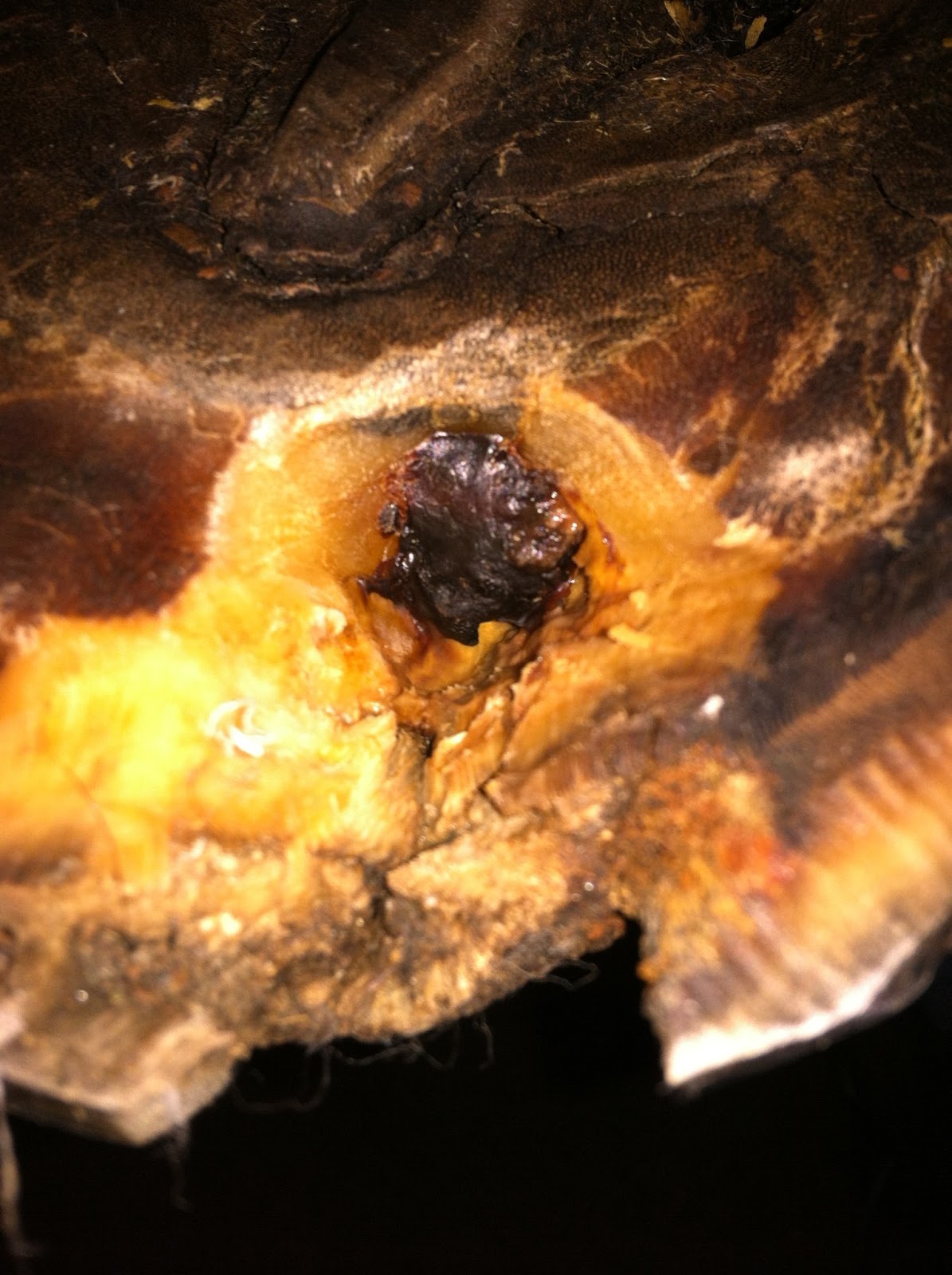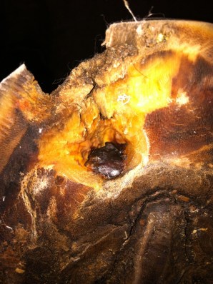 Healing continues apace. He has had three days of 5 minutes of handwalking and is doing beautifully, very eager to move out, sound to my eye. The drainage is, knock wood, slowly decreasing. When I sent the 2 week pictures to the vet hospital they said it looked good and suggested that the local vet could take a hoof knife and pare off the top blood clot to get a clearer sense of what the wound looks like underneath.