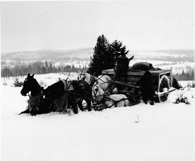 In the meantime: have a cool photograph. This was taken near Crystal Lake Falls in Barton, VT in 1941. Before snowplows, rolling and/or scraping snow was the order of the day. The idea was not to get ride of the snow but to make it a smoother surface for sleighs to travel on. In the 1940s, Vermont didn’t have an interstate highway system or really even much in the way of paved roads – or electricity. It’s still a very rural place, but not quite like this anymore!